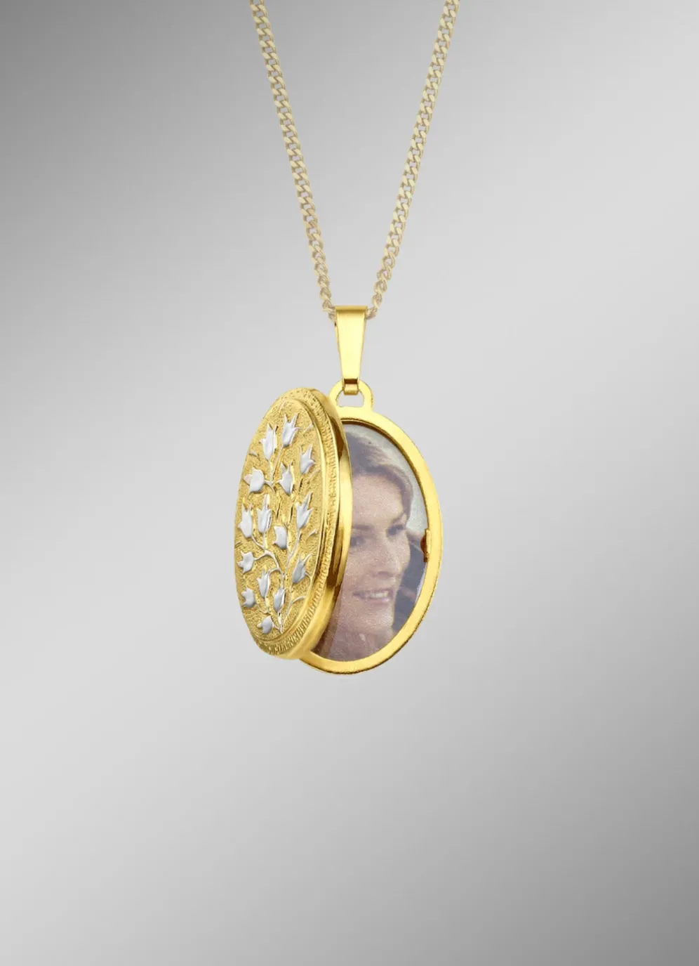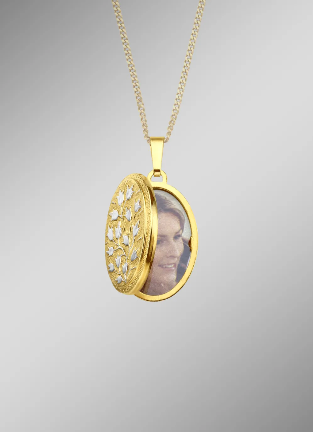Die Lieblingsbilder schmuckvoll inszeniert. Dieses hübsche Medaillon in Bicolor ist mit einem Blumen-Motiv auf der Vorderseite verziert und hat eine Abmessung von 17×23 mm. Das edle Schmuckstück lässt sich aufklappen um z.B. ein kleines Foto einzustecken.