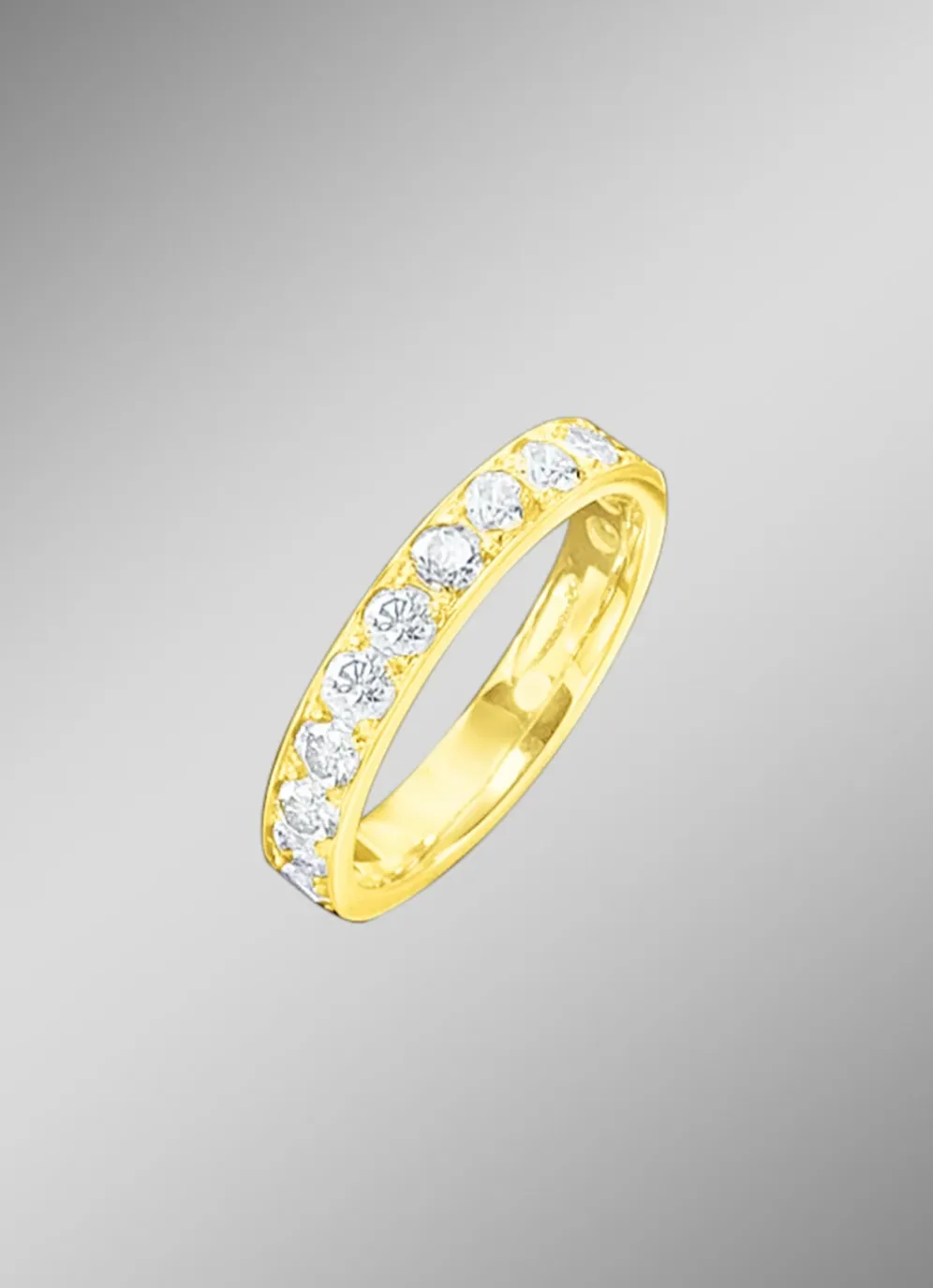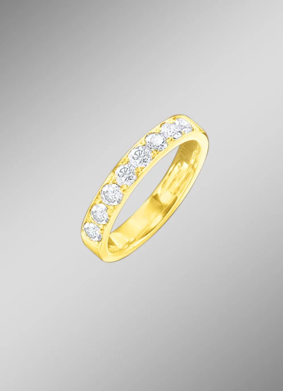 Die streng nebeneinander angeordneten champagnerfarbenen Brillanten entfalten zusammen eine ganz eigene Dynamik und geben dem Ring einen ungewöhnlich intensiven Glanz. Der vollmassive Damenring mit einer 4 mm breiten Ringschiene ist in verschiedenen Varianten erhältlich: