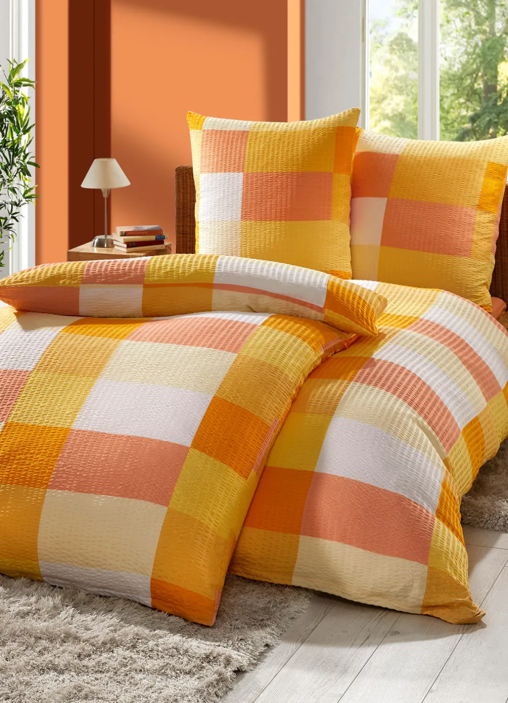 Mit ihrer sommerlichen, leuchtenden Farbkombination wird diese karierte, beidseitig bedruckte Bettwäsche-Garnitur in Ihrem Schlafzimmer bestens zur Geltung kommen. Mit praktischem Reißverschluss ausgestattet. Die bügelfreie Qualität: Microfaser-Seersucker aus 100% Soft Touch-Polyester. Waschbar bis 60 °C und trocknergeeignet