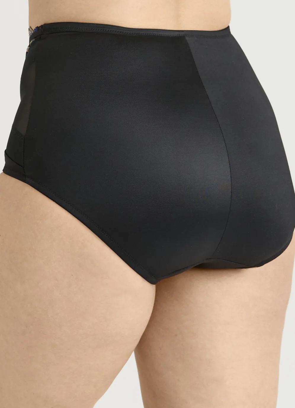 Sanft formender „Miss Mary“-Miederslip in Schwarz, mit effektvoller Tüllstickereispitze und elastischen Tülleinsätzen im Vorderteil sowie Baumwolleinlage im Schritt.