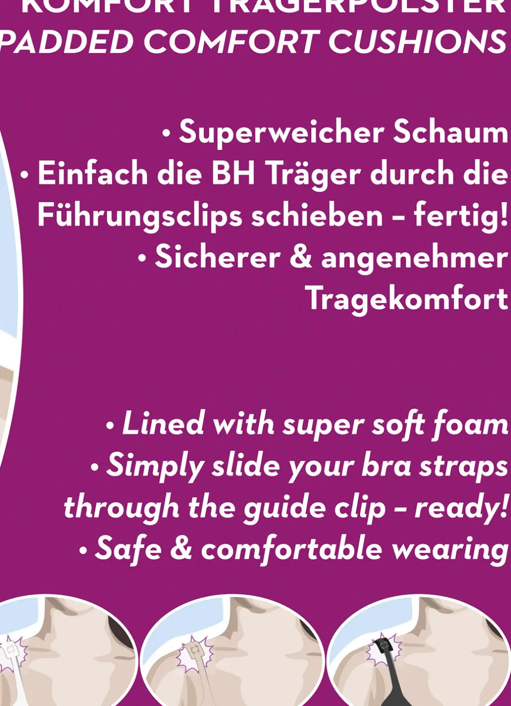 Weich gepolsterte „Miss Perfect“ Trägerpolster für einen hohen Tragekomfort, mit dem Haltehäkchen ganz einfach am BH-Träger zu befestigen. Kann das Verrutschen der Träger sowie Druckstellen auf der Schulter verhindern. Passend für nahezu alle schmaleren Trägerbreiten (ca. 1,5-1,8 cm).