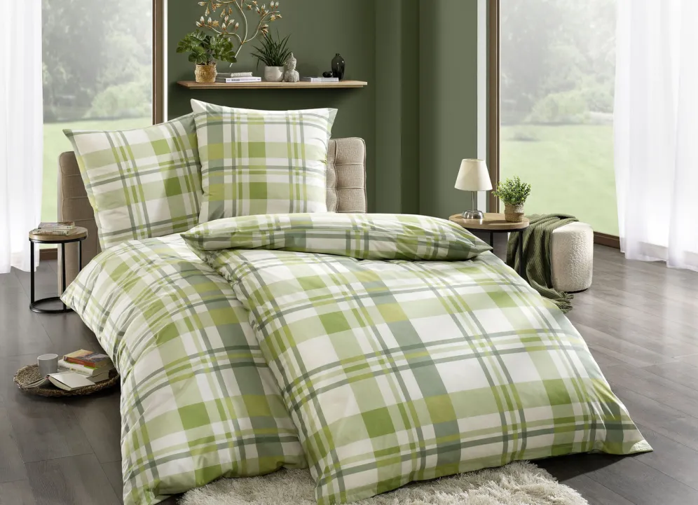 In modernen Dessinierung mit Karos präsentiert sich diese pflegeleichte, beidseitig bedruckte Garnitur in angenehmer Farbkombination. Mit praktischem Reißverschluss. Die Qualität: Polycotton aus 50% Baumwolle und 50% Polyester. Waschbar bis 60 °C und trocknergeeignet