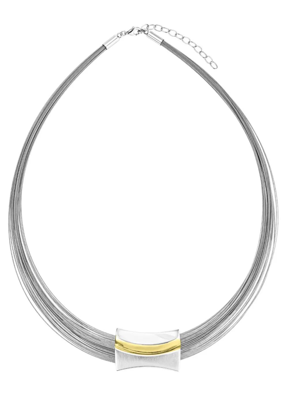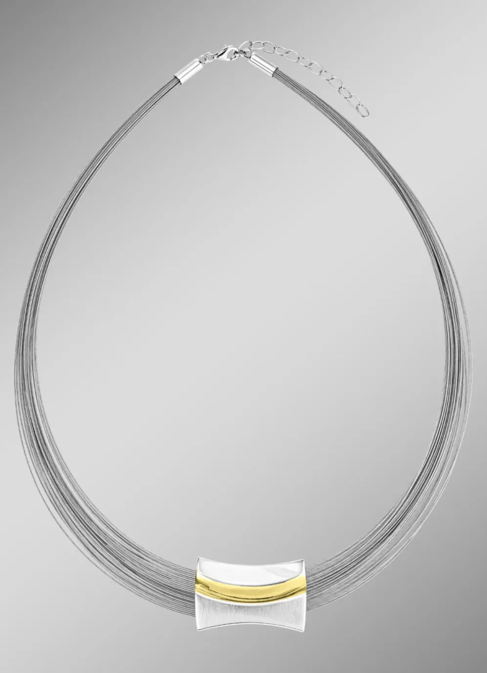 Entdecken Sie die perfekte Kombination aus zeitloser Eleganz und moderner Vielseitigkeit mit unserer exquisiten Garnitur. Diese Garnitur, bestehend aus einer Halskette und einem Armband, vereint glänzende und mattierte Oberflächen in einem mehrreihigen Design, das sowohl im Alltag als auch zu besonderen Anlässen beeindruckt.