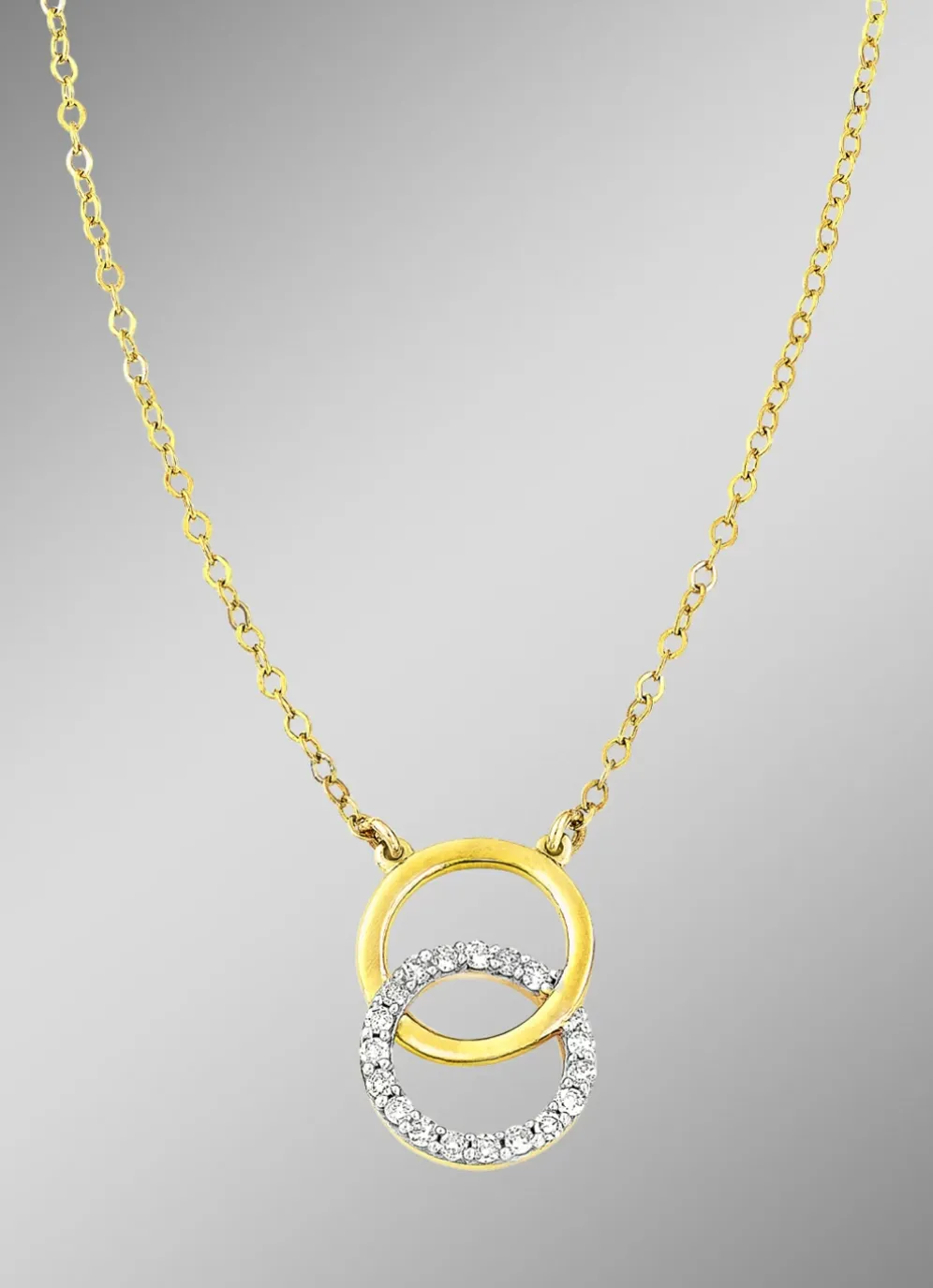 Diese moderne Halskette aus Gold 585/- fein ist einfach formvollendet schön. Das Mittelteil besteht aus 2 verschlungenen Ringen, jeweils 10×14 mm, von denen einer mit 18 Diamanten, zusammen ca. 0,13 ct., Weiß, Piqué 2 besetzt ist. Ein stilvoller Blickfang im Dekolleté!