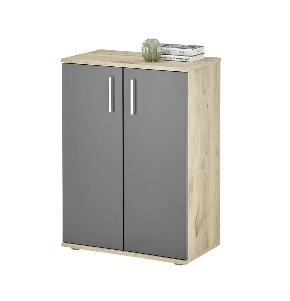 Moderne, kombistarke Kommoden in der Farbe Eiche-Grau. Mit Griffen und Füßen aus Kunststoff. Mit Aufbau-Anleitung zur einfachen Selbstmontage.