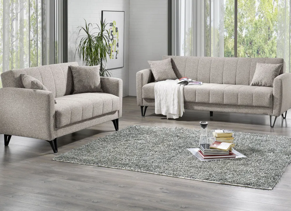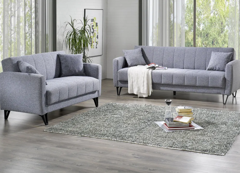 Moderne Polstermöbel auf stabilem Holzgrundgestell mit Nosagunterfederung und Federkern in den Sitz- und Rückenflächen. Bezug aus Webstoff (80% Polypropylen, 20% Polyester). Rückseiten mit Originalstoff bezogen, daher frei im Raum aufstellbar. Alle Elemente mit Kippfunktion. Auf schwarzen Kunststofffüßen. Maße: Höhe je 85 cm, Tiefe 83 cm, Sitzhöhe 49 cm, Sitztiefe je 54 cm. Mit Aufbau-Anleitung zur Endmontage
