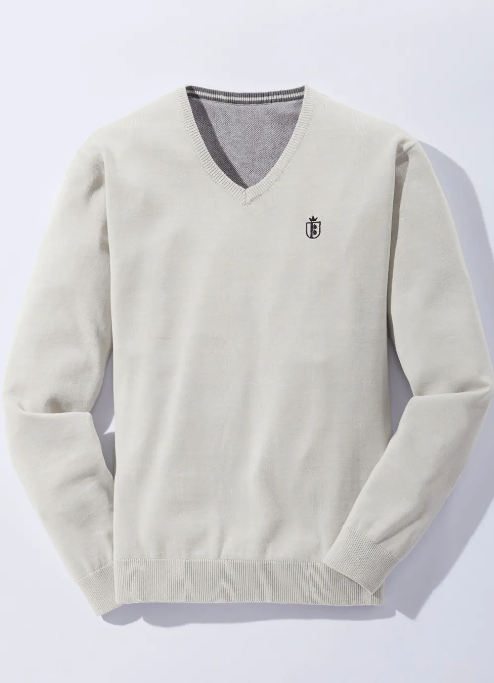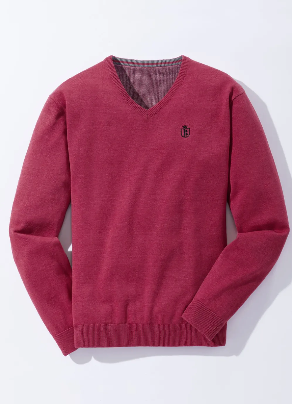 Modischer V-Pullover mit Zierstickerei auf der linken Vorderseite sowie Rippenstrick-Abschlüsse.