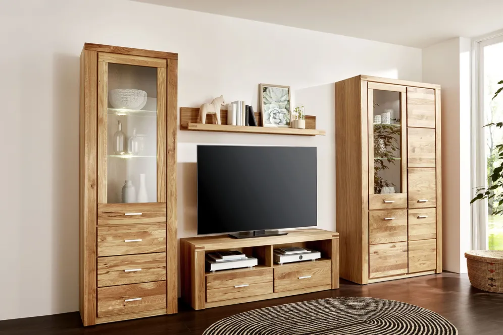 Möbelprogramm mit Massivholzfronten in der Ausführung Wandboard und in Wildeiche.