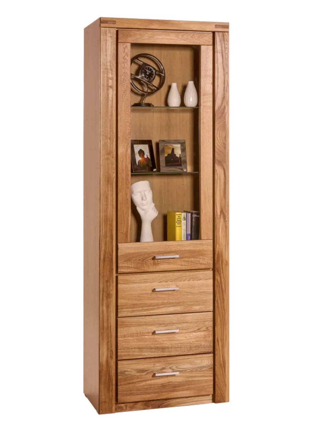 Hochwertiges und perfekt zu kombinierendes Möbelprogramm. Mit Massivholzfronten und durchgehender Lamelle. Korpus aus Furnier in Kernbuche oder Wildeiche geölt. Vitrinen mit LED-Beleuchtung (230 Volt, 50 Hz, nicht austauschbar). Die aluminiumfarbenen Griffe unterstreichen den geschmackvollen Stil. Schubladen auf Metallführungsschienen. Die Lieferung erfolgt aufgebaut