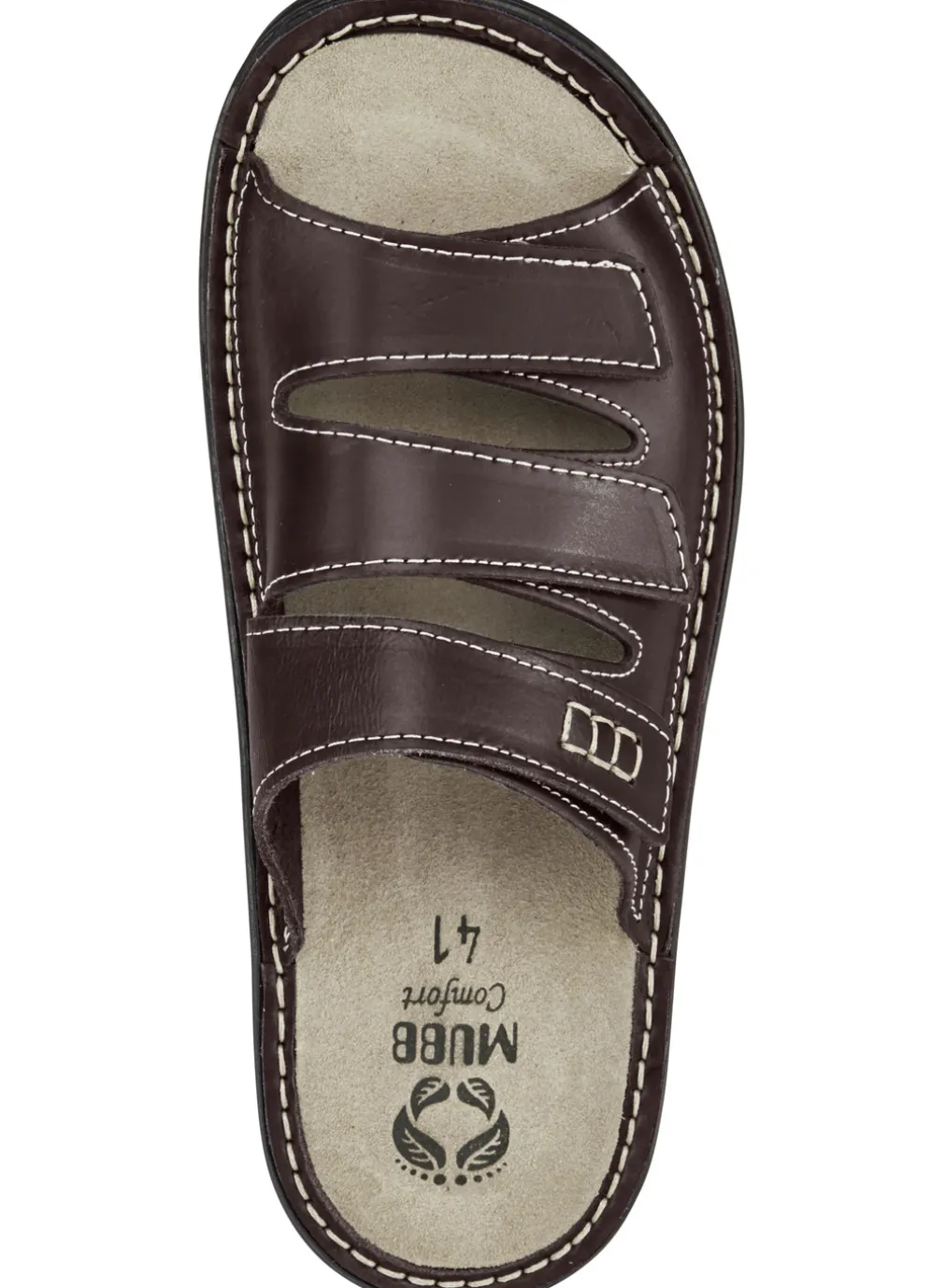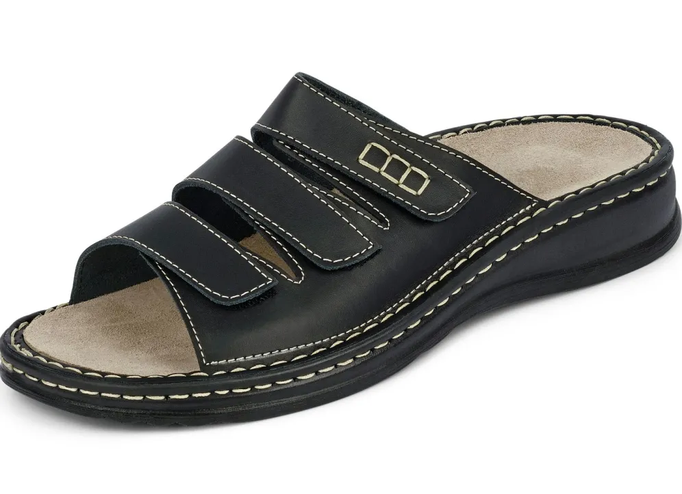 Pantoletten aus Rind-Nappaleder: Weite H, drei verstellbare Klettspangen, herausnehmbares Lederfußbett sowie PU-TPR-Laufsohle