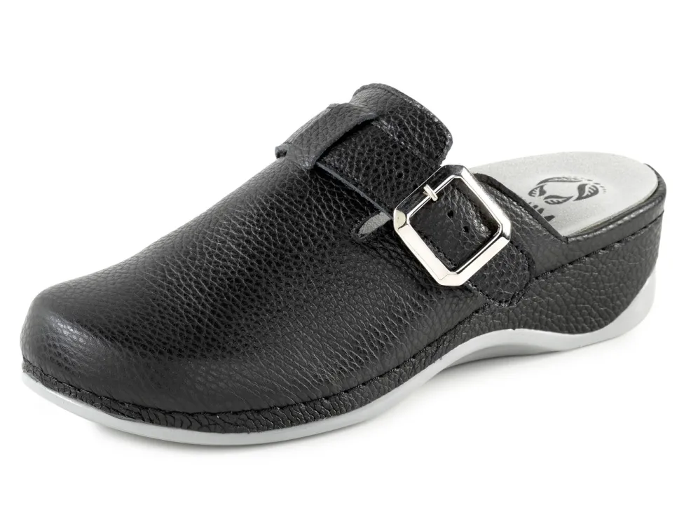 Clogs aus genarbtem Nappaleder, mit angenehmer Polsterung: Weite H, verstellbare Schließe, elastisches Textilfutter, herausnehmbares Lederfußbett, PU-TR-Laufsohle sowie 35 mm Keilabsatz