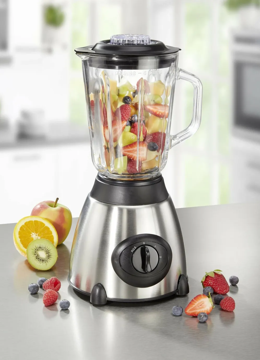 Standmixer aus Edelstahl mit 2 Geschwindigkeitsstufen (mittel und stark) und Pulse-Funktion. Ideal für fruchtige Smoothies, schaumige Milch-Shakes, Cocktails, Saucen, Babynahrung zum Pürieren, Mixen, Schlagen, Zerkleinern und Eis-Crushen. Kälte- und hitzebeständig, auch für Suppen geeignet.