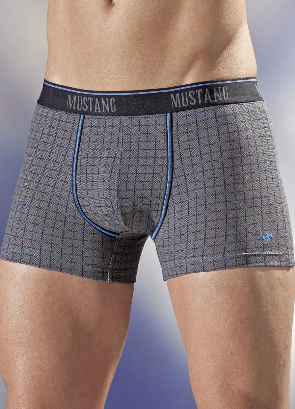„Mustang“-Pants mit tollem Alloverdessin, Elastikbund, Kontrastpaspeln, kleinem Stickereilogo sowie unterlegtem Vorderteileinsatz und Schrittverstärkung.