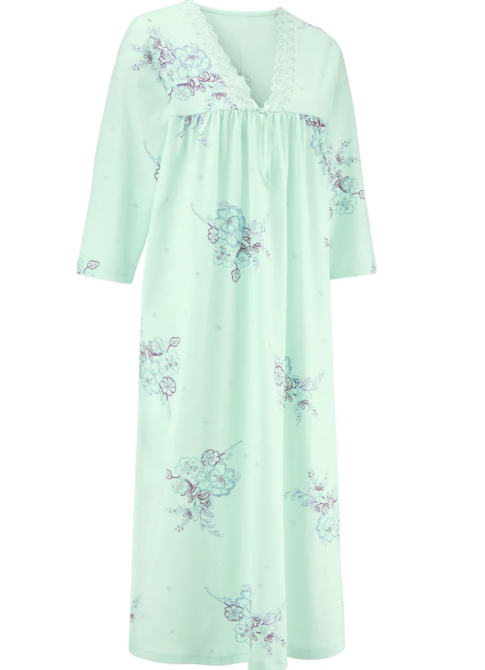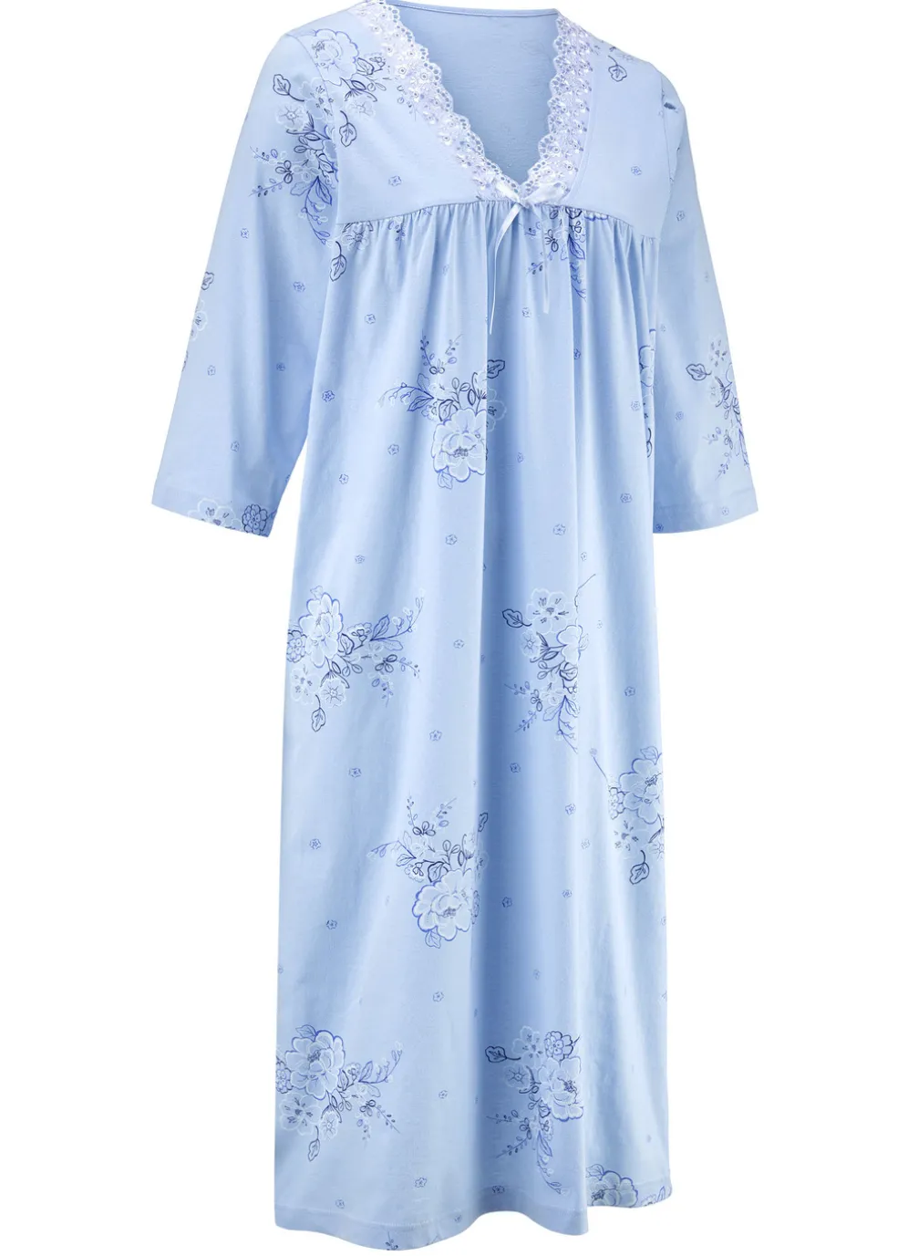 Nachthemd, 3/4-lange Ärmel und V-Ausschnitt in Hellblau-Bunt und in Größe 40.