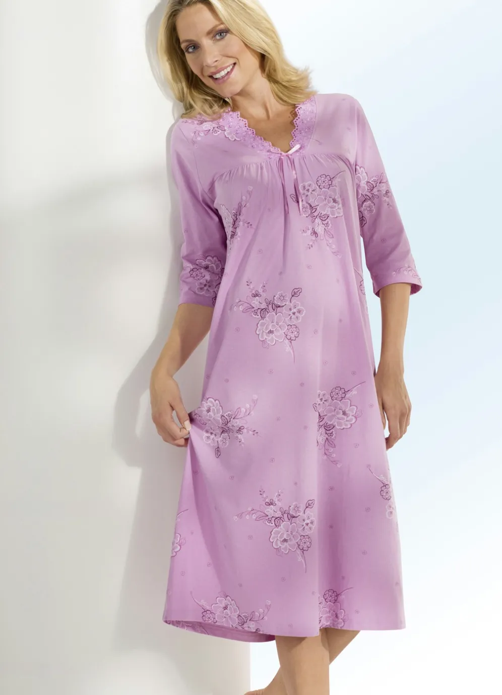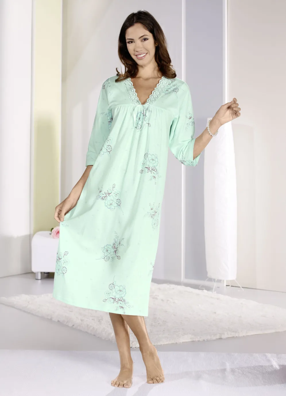 Hinreißendes, wadenlanges Nachthemd mit Stickereispitze am V-Ausschnitt, Satinzierschleife, Raffungen an der Vorderpasse sowie 3/4-langen Ärmeln.