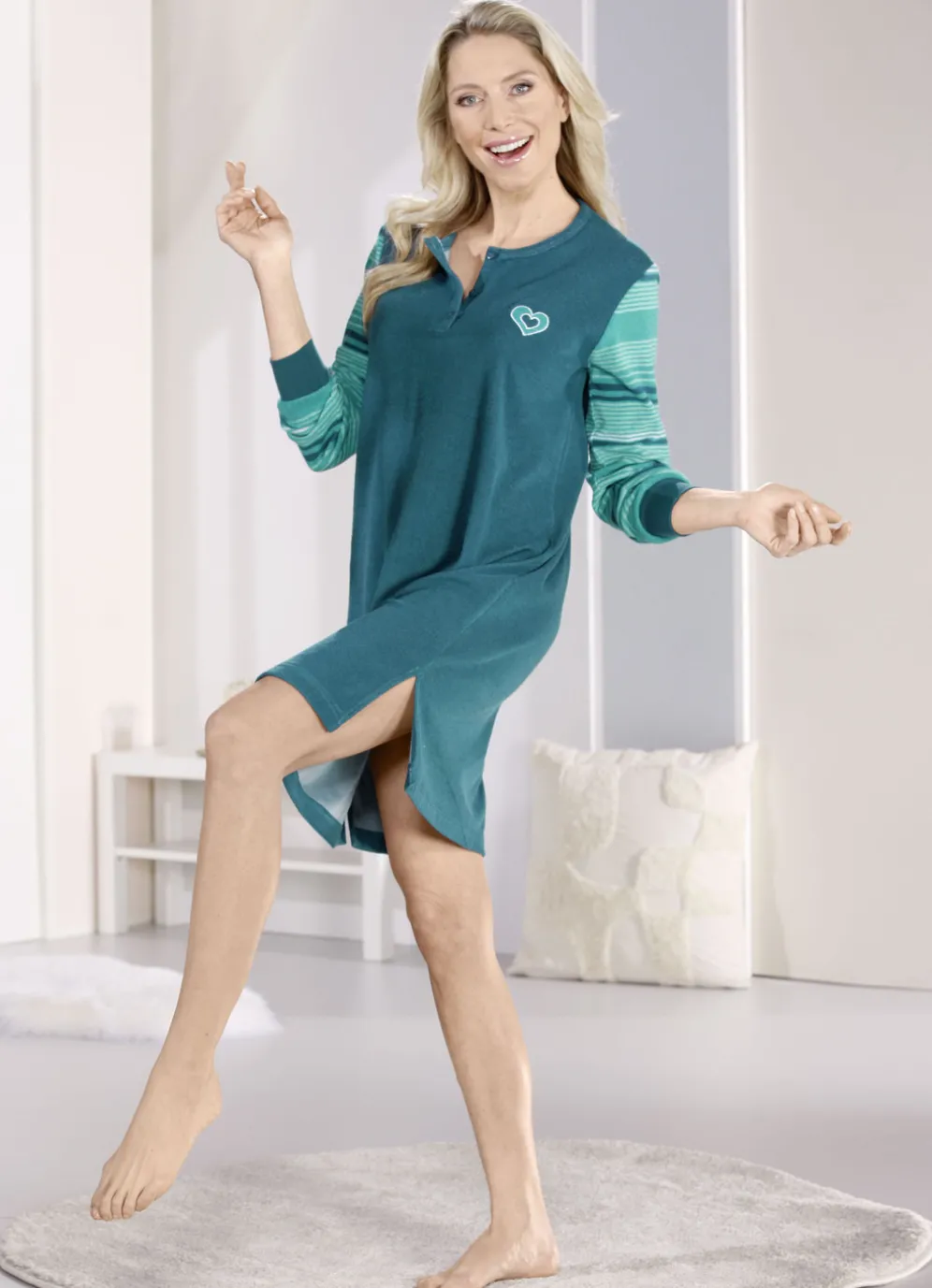 Knielanges Nachthemd in Petrol-Bunt: Knopfleiste, platzierte „Herzchen“-Stickerei, lange Raglanärmel