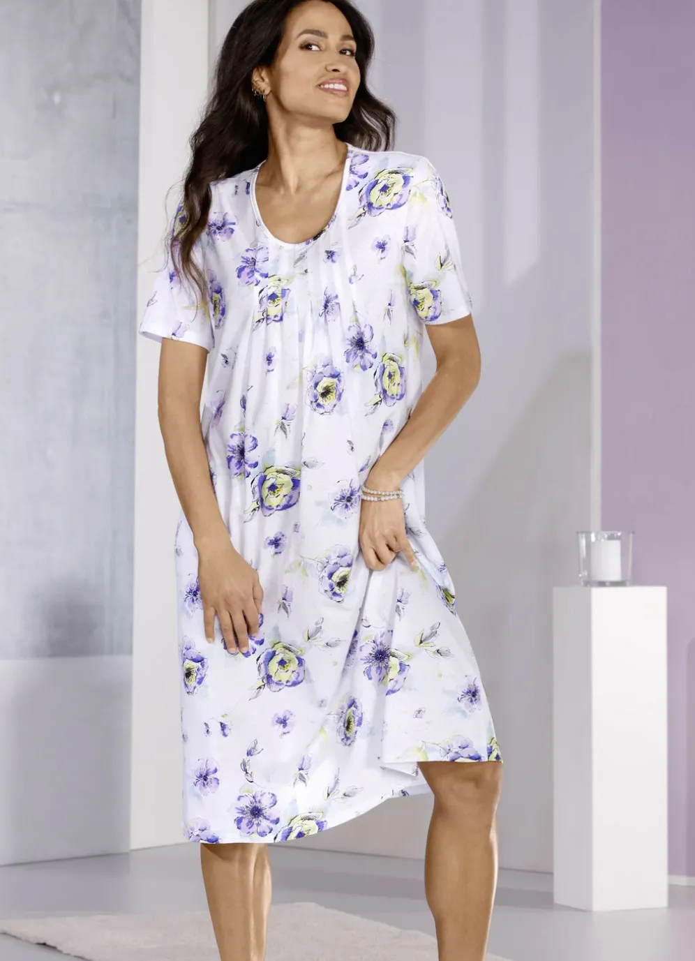 Bezauberndes, knielanges Nachthemd in Weiß-Viola-Bunt: Faltenlegung unterhalb der Absteppung am Dekolleté sowie kurze Ärmel.