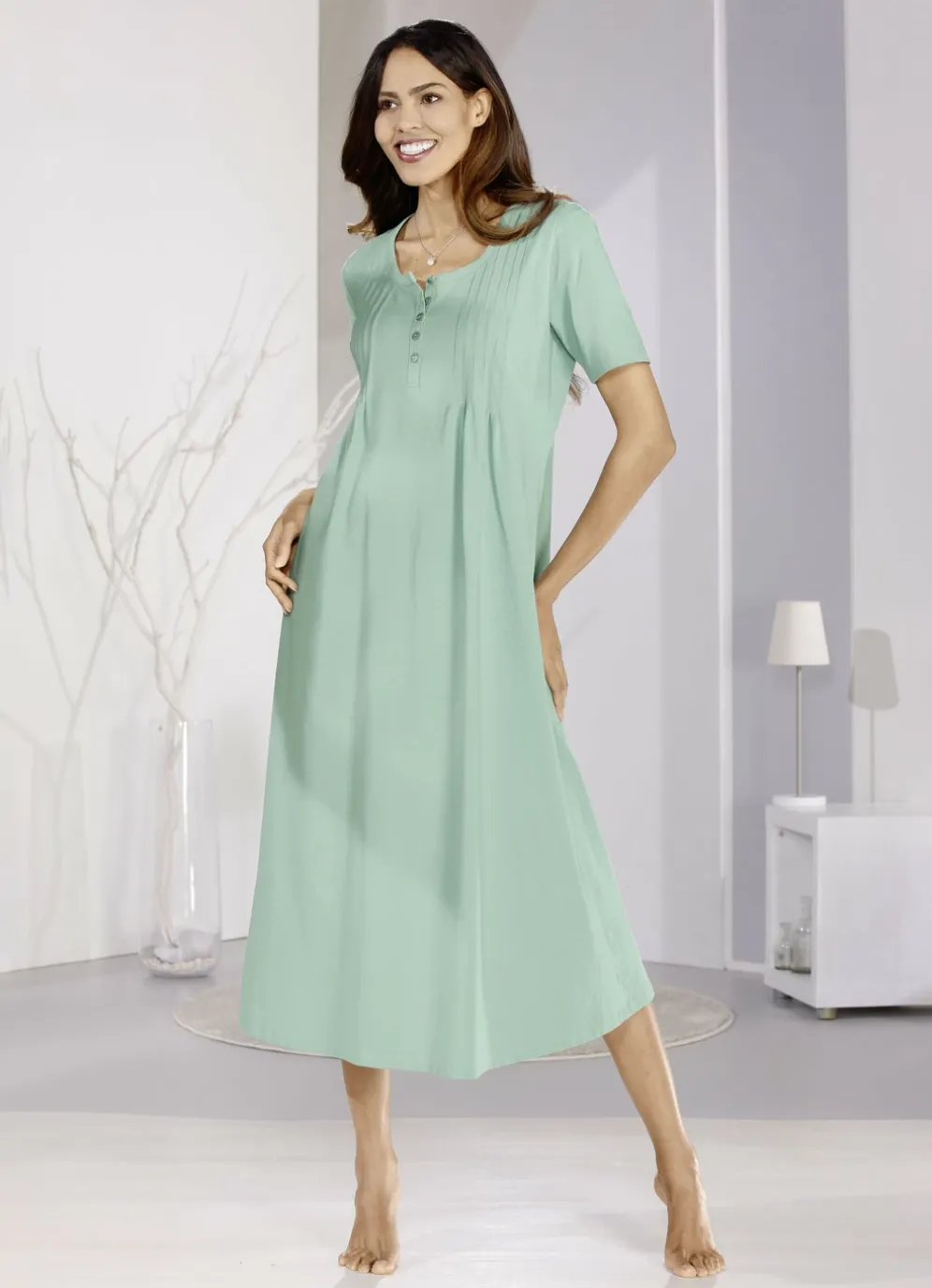 Knöchellanges Nachthemd in Jade, mit Knopfleiste, aufwendiger Biesenverarbeitung sowie kurzen