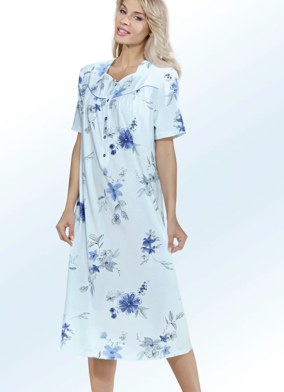 Feminines, wadenlanges Nachthemd mit langer Knopfleiste, Paspelzier an der Vorderpasse, Raffungen vorne sowie kurzen Ärmeln.
