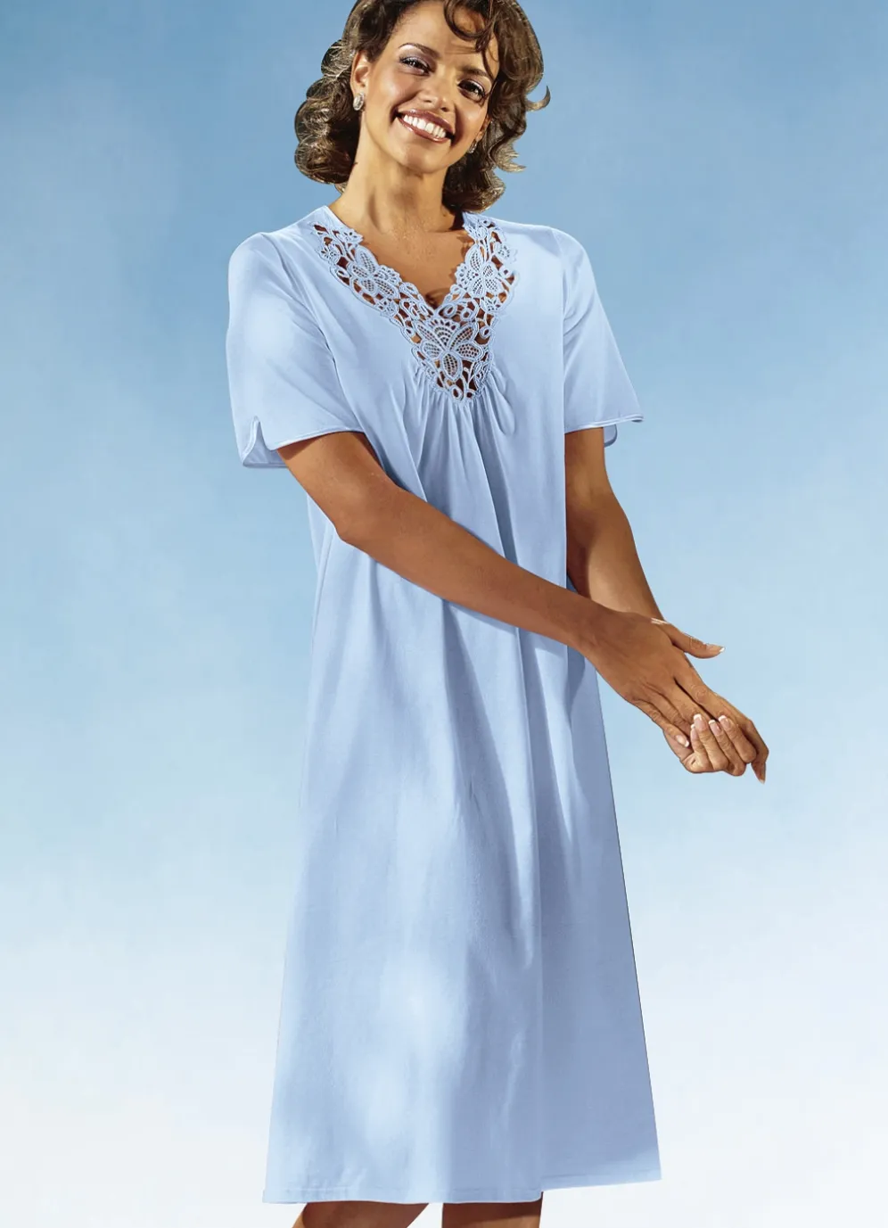 Nachthemd, Kurzarm mit Spitze am V-Ausschnitt in Bleu und in Größe 40.