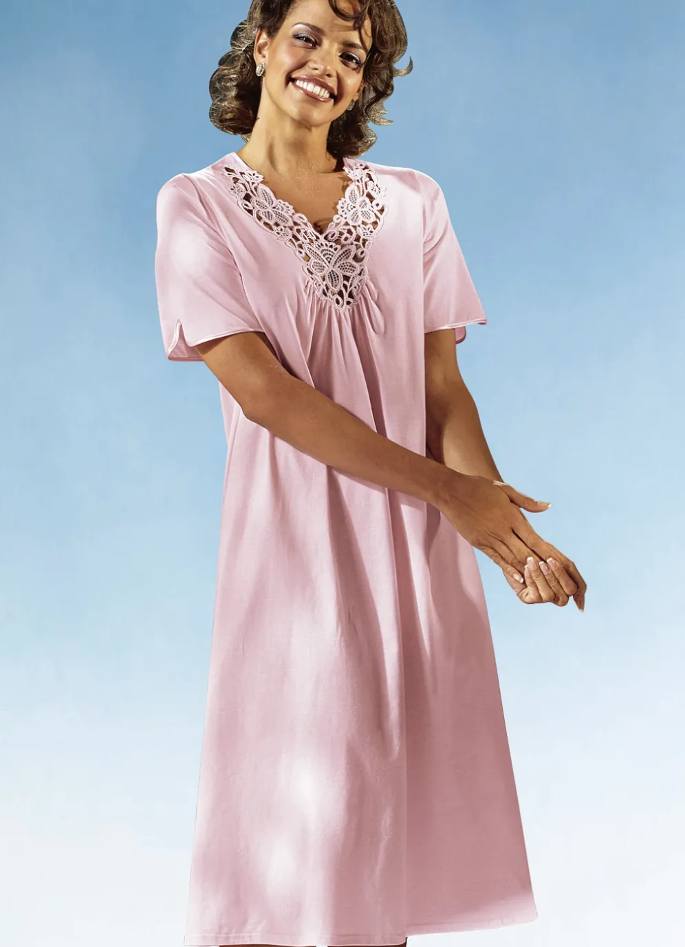 Wunderhübsches, wadenlanges Nachthemd mit großzügiger Stickereimotivspitze am vorderen Dekolleté, Raffung vorne sowie Satinbandeinfassung am hinteren Halsausschnitt und an den abgerundeten Abschlüssen der kurzen Ärmel. Kleine Schlitze mit abgerundeten Saumkanten am Ärmel.
