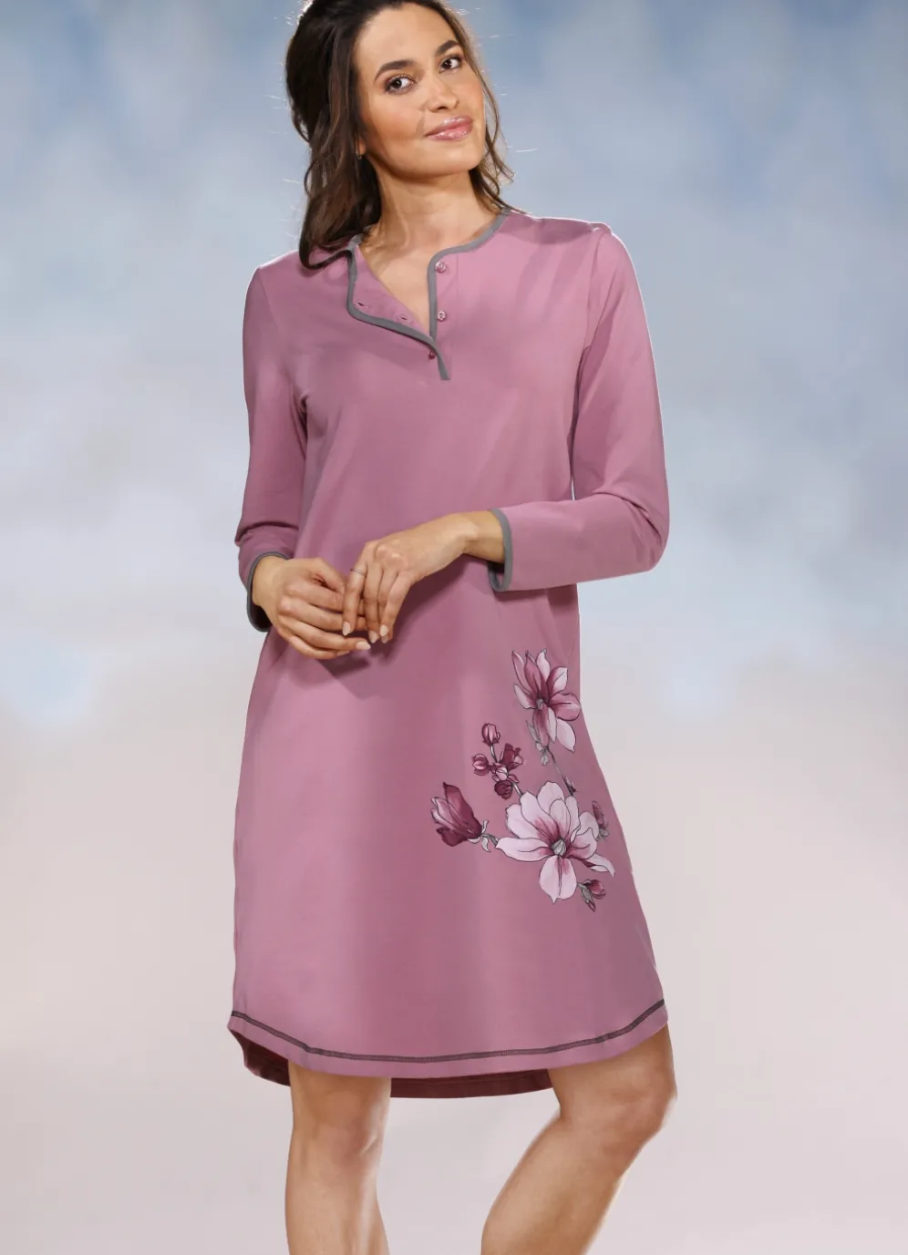 Nachthemd, Langarm mit Knopfleiste in Rosenquarz und in Größe 38.