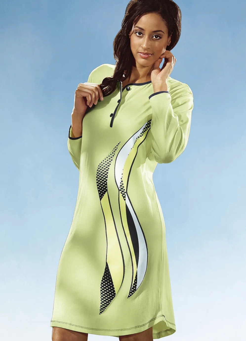 Knielanges Nachthemd mit platziertem Motivdruck vorne, Kontrasteinfassung am Halsausschnitt, entlang der Knopfleiste und an den Abschlüssen der langen Ärmel sowie Kontraststeppung am abgerundeten Saum.