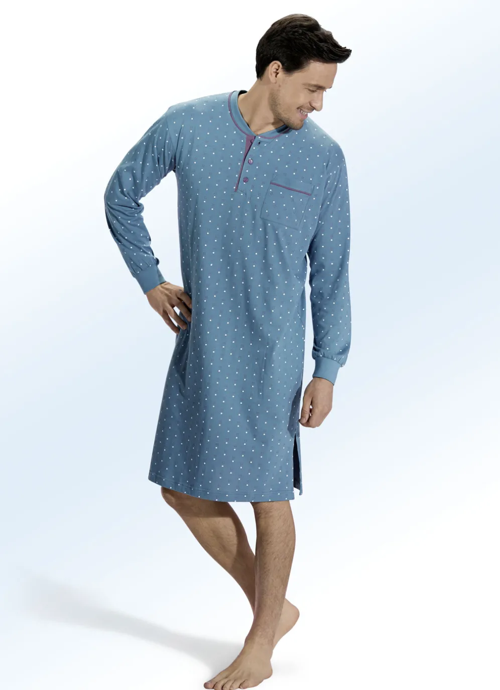 Dieses komfortable Nachthemd in Blaugrau-Beere sorgt für erholsamen Schlaf. Mit Knopfleiste,