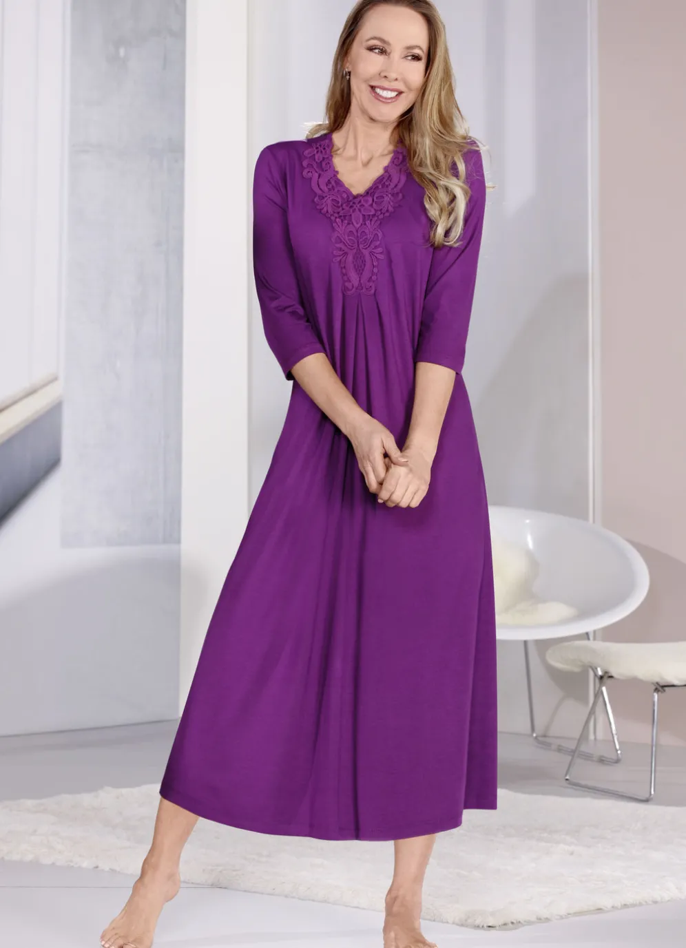 Apartes, knöchellanges Nachthemd: großzügige Motivspitze, Kellerfalten, 3/4-lange Ärmel.