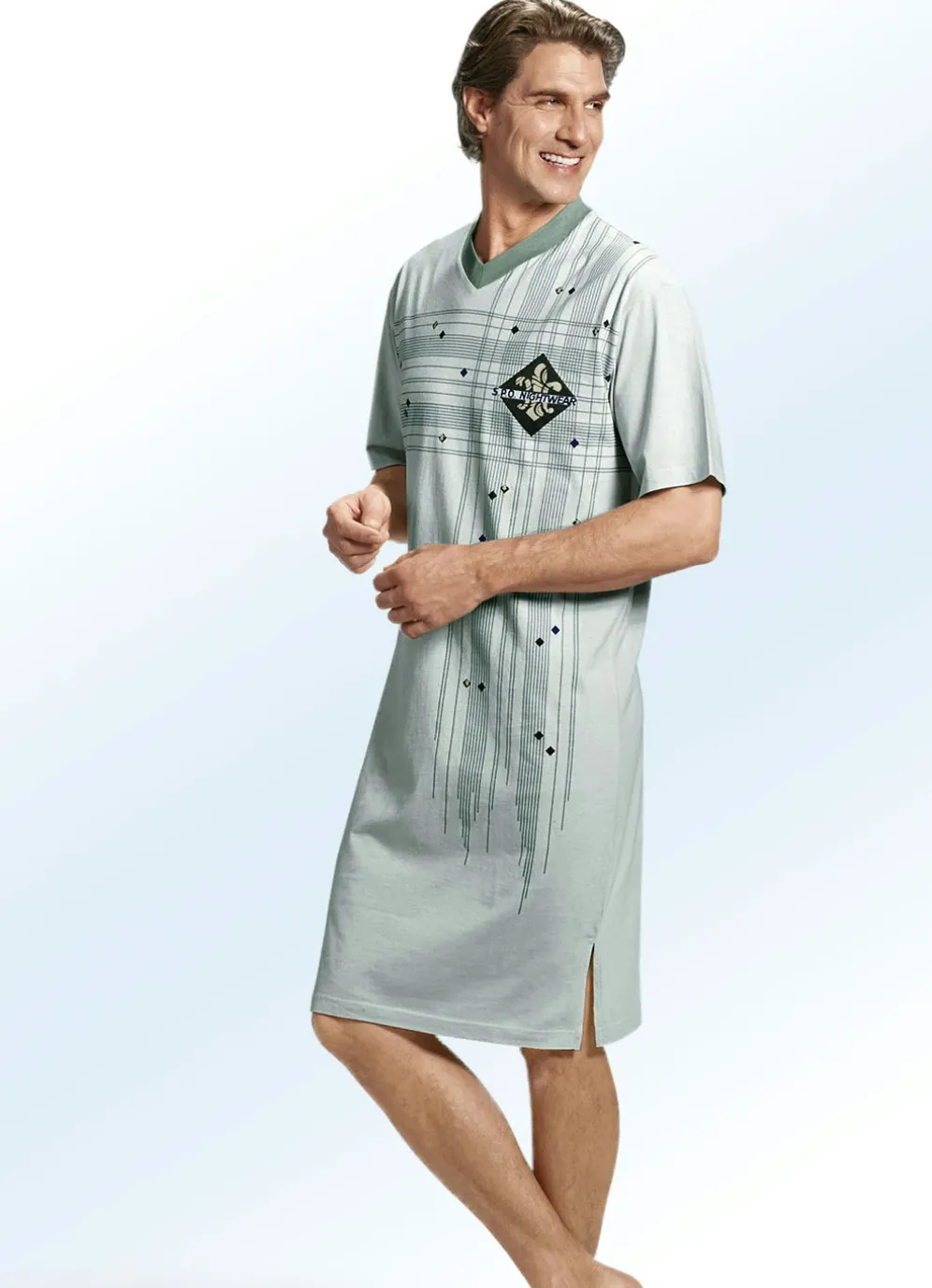 Hellgrünes, vorne dessiniertes Nachthemd mit V-Ausschnitt, platziertem Druckmotiv und Seitenschlitzen.
