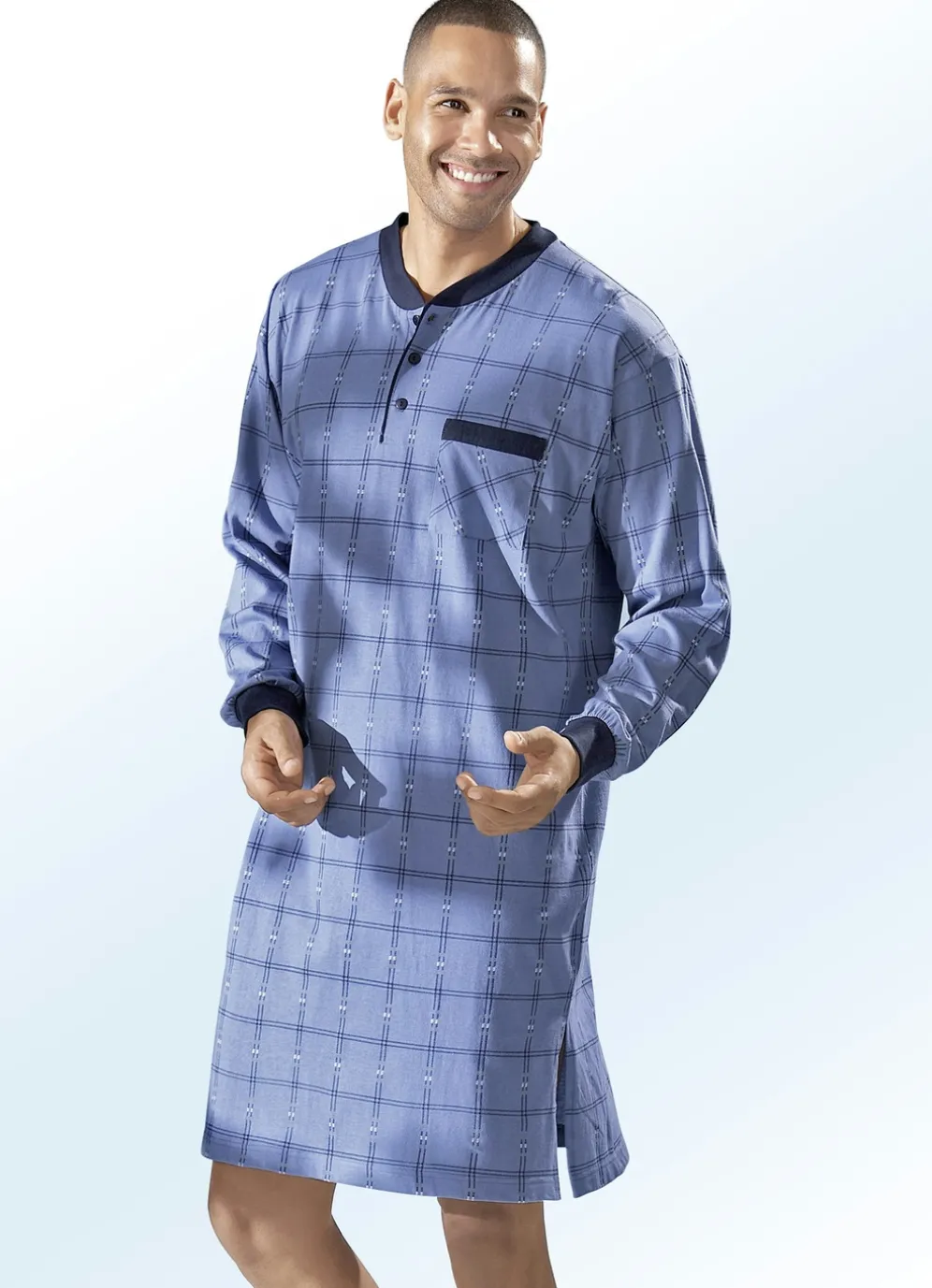Komfortables Nachthemd in Jeansblau-Marine-Bunt mit Wohlfühlcharakter: Es ist mit Knopfleiste, Blende an der aufgesetzten Brusttasche und komfortablen Bündchen an den langen Ärmeln gearbeitet. Die Seitenschlitze sorgen für genügend Bewegungsfreiheit.