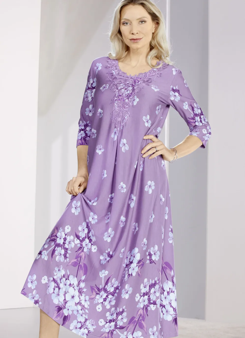 Nachthemd von „Laurina“ mit Motivspitze am Ausschnitt in Lila und in Größe 38.
