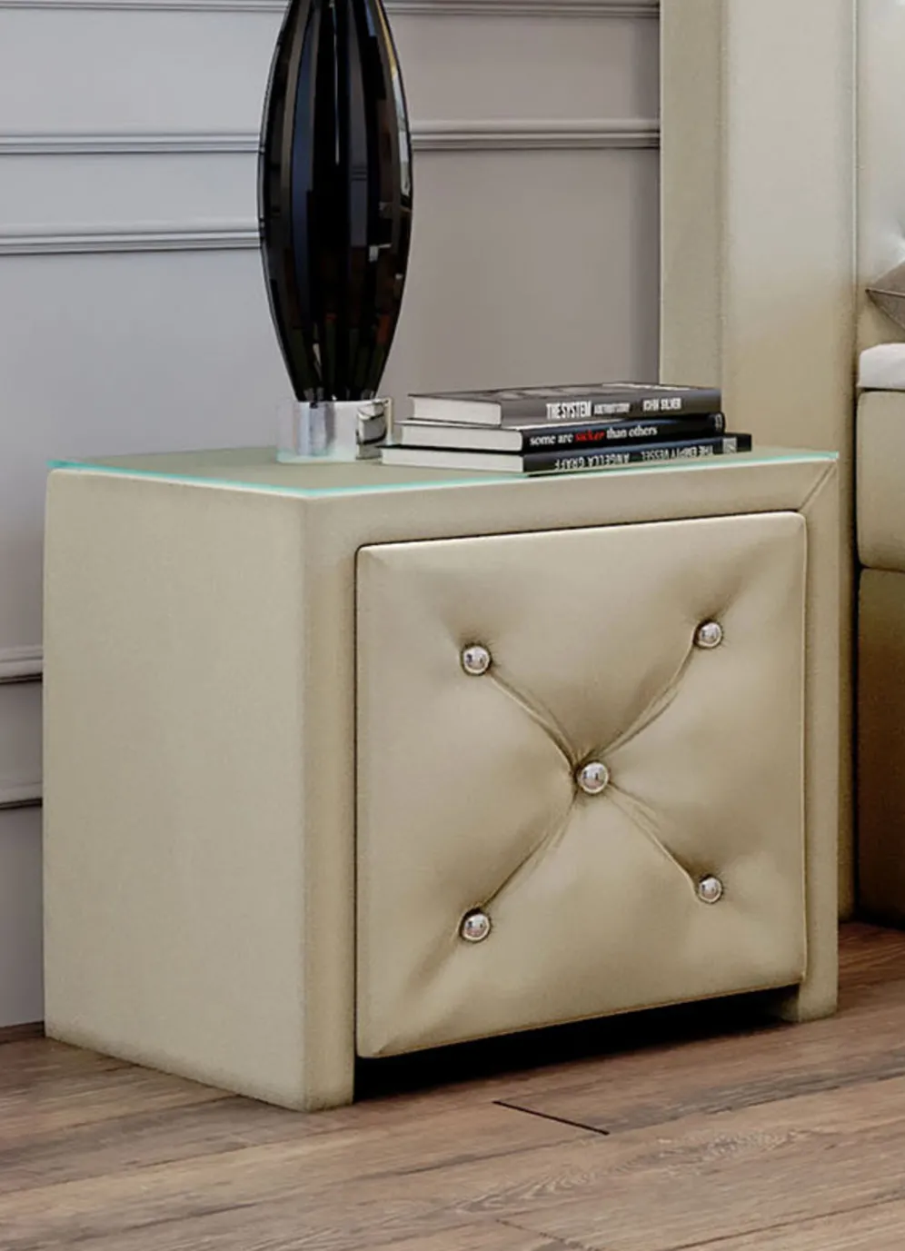 Passend zum Boxspringbett mit LED-Beleuchtung: Raffinierter Nachttisch mit Schublade und Glasplatte. Schublade mit Steppung und Strasssteinen. Maße: B50xH50xT50 cm.