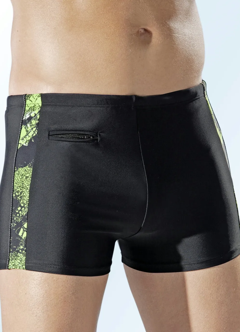 Tolle, schwarze „Naturana“-Badehose: höhere Kastenform, grüne Einsätze, Kordelzug im Dehnbund, Reißverschlusstasche, Vorderfutter.