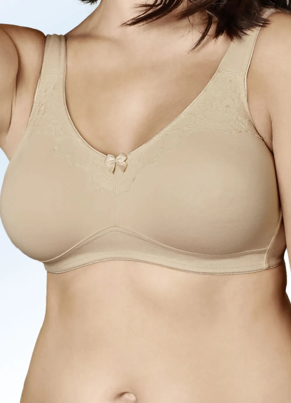 Hautsympathischer BH von „Naturana“, mit doppelt vorgeformten Cups, Spitzenbesatz im Vorderteil sowie im Schulterbereich weich gepolsterten, verstellbaren Stretchträgern.