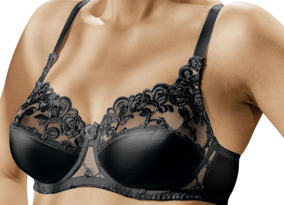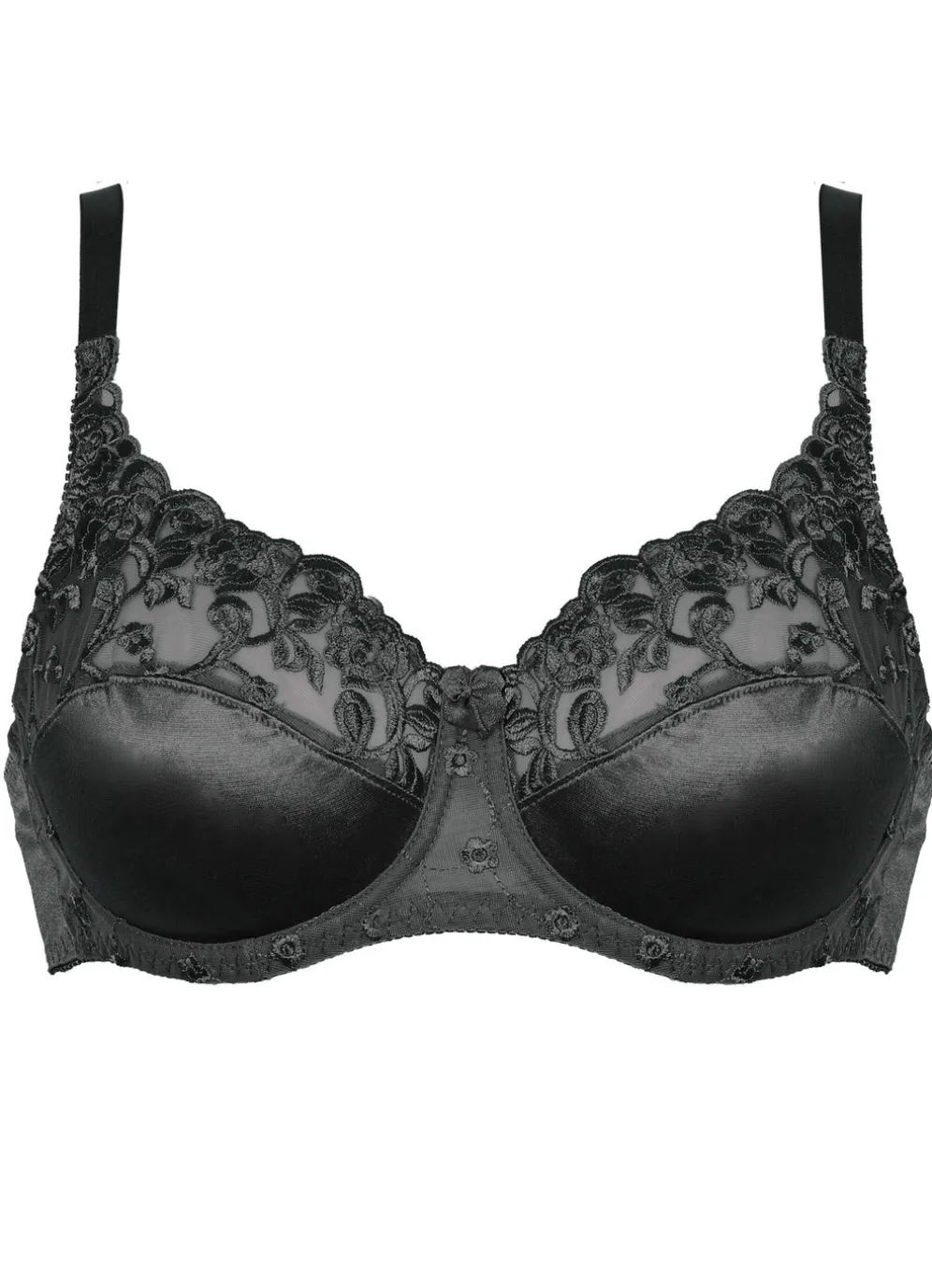 Glänzender Bügel-BH von „Naturana“, mit Tüllstickerei im Vorderteil, seitlicher Cupverstärkung sowie verstellbaren Stretchträgern.