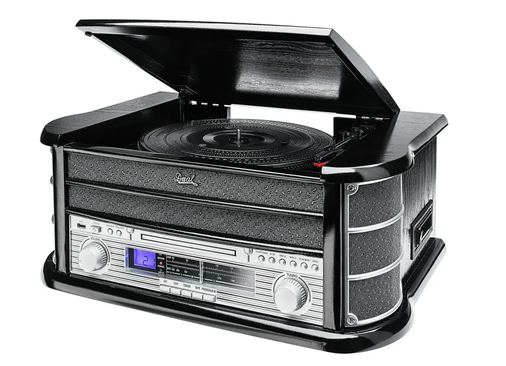MP3-Direktaufnahmefunktion von Platte, CD, Radio und Kassette auf USB. Eingebaute Stereo-Lautsprecher mit 2x 5 Watt maximaler Musikleistung. Praktische Fernbedienung. Maße: B50xH21xT34 cm