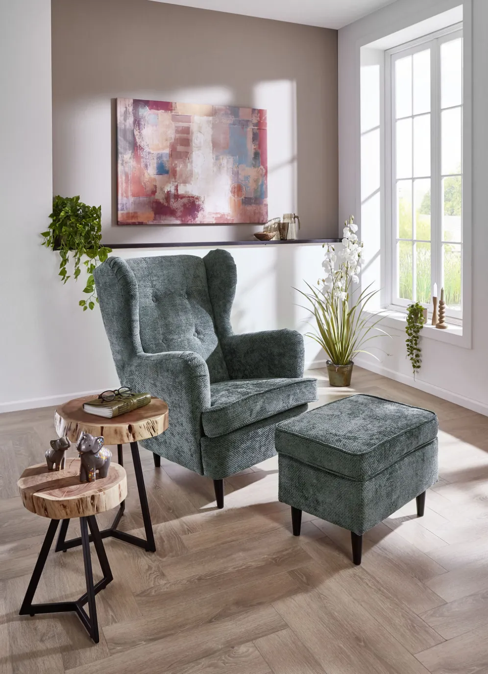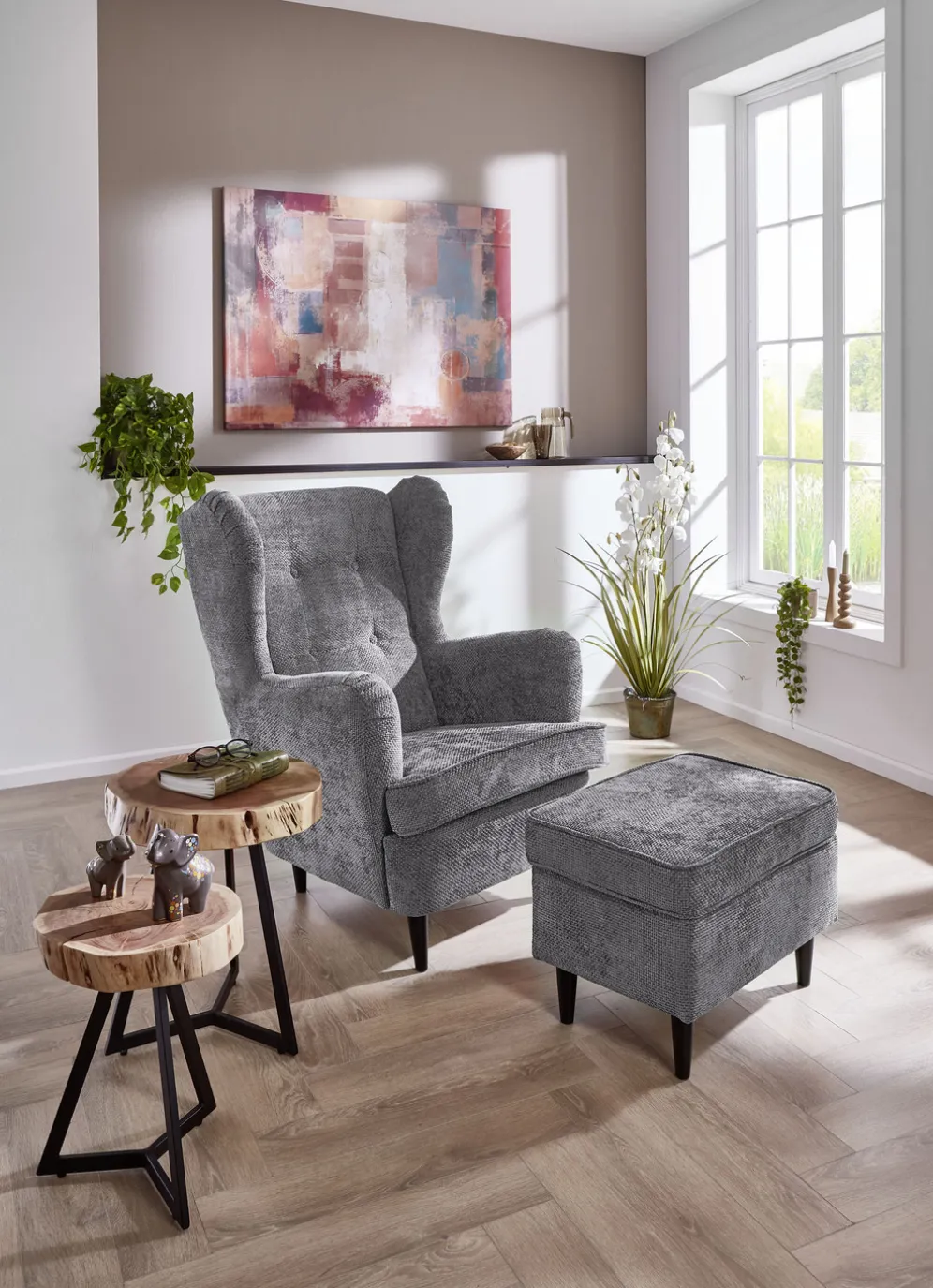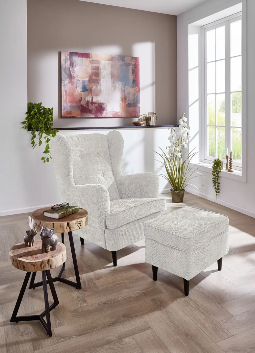 Genießen Sie pure Entspannung mit diesem aparten Ohrenbackensessel mit dazu passendem Hocker!