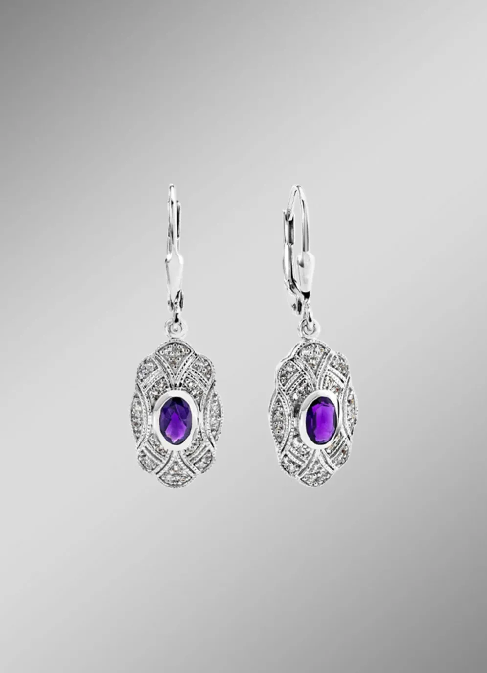 Diese Ohrringe sind mit strahlenden, echten Weißtopasen und leuchtenden, echten Amethysten verziert. Die Kombination dieser Edelsteine schafft ein faszinierendes Farbspiel, das jeden Blick auf sich zieht und Ihrem Outfit einen Hauch von Glamour verleiht.