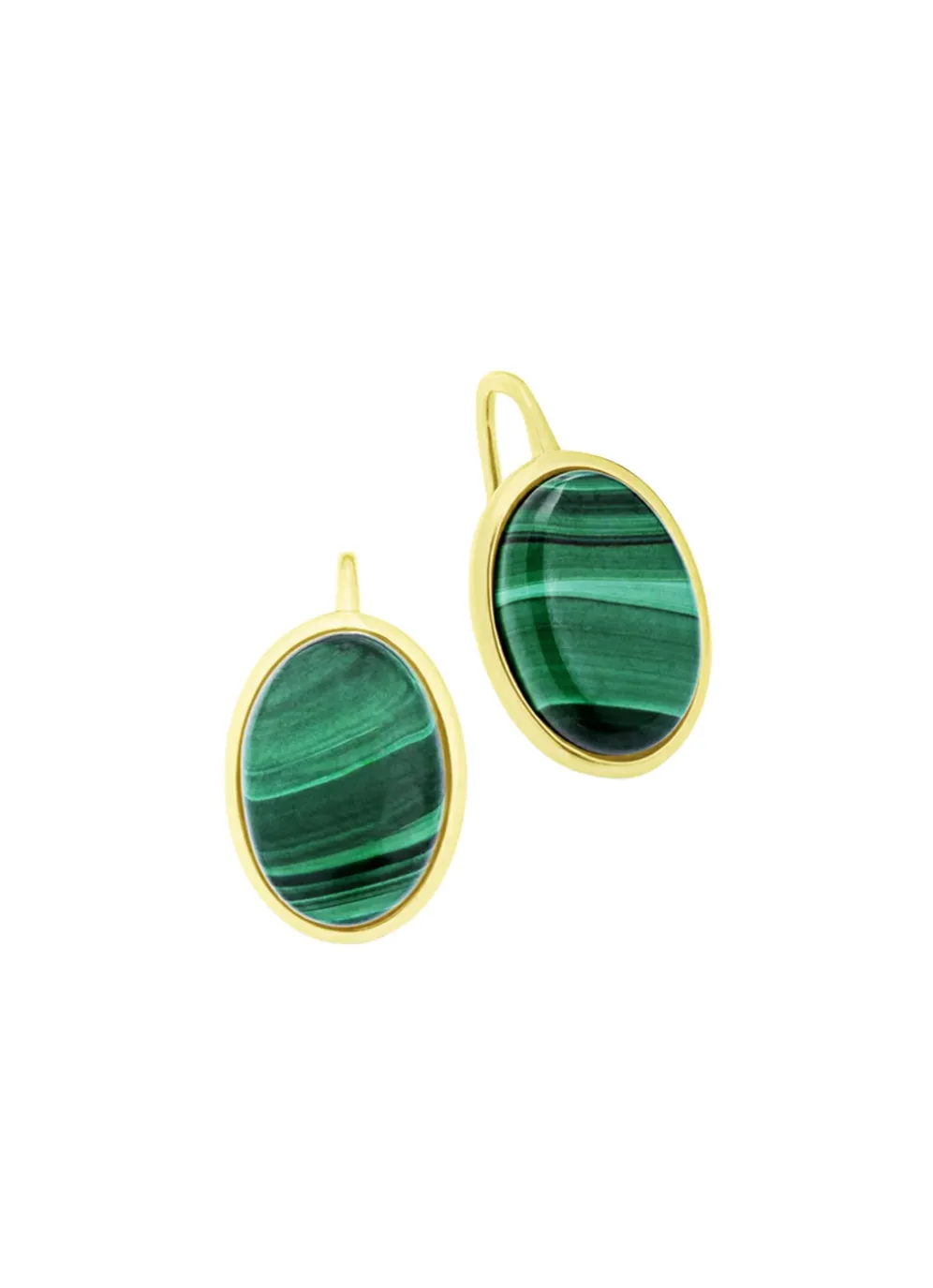 Diese vergoldeten Ohrringe sind aus feinem Silber 925/- gefertigt. Die grünen Malachitsteine haben eine einzigartige Maserung, die jedem Paar einen individuellen Charakter verleiht. Die Ohrringe haben eine Größe von 19×12 mm.