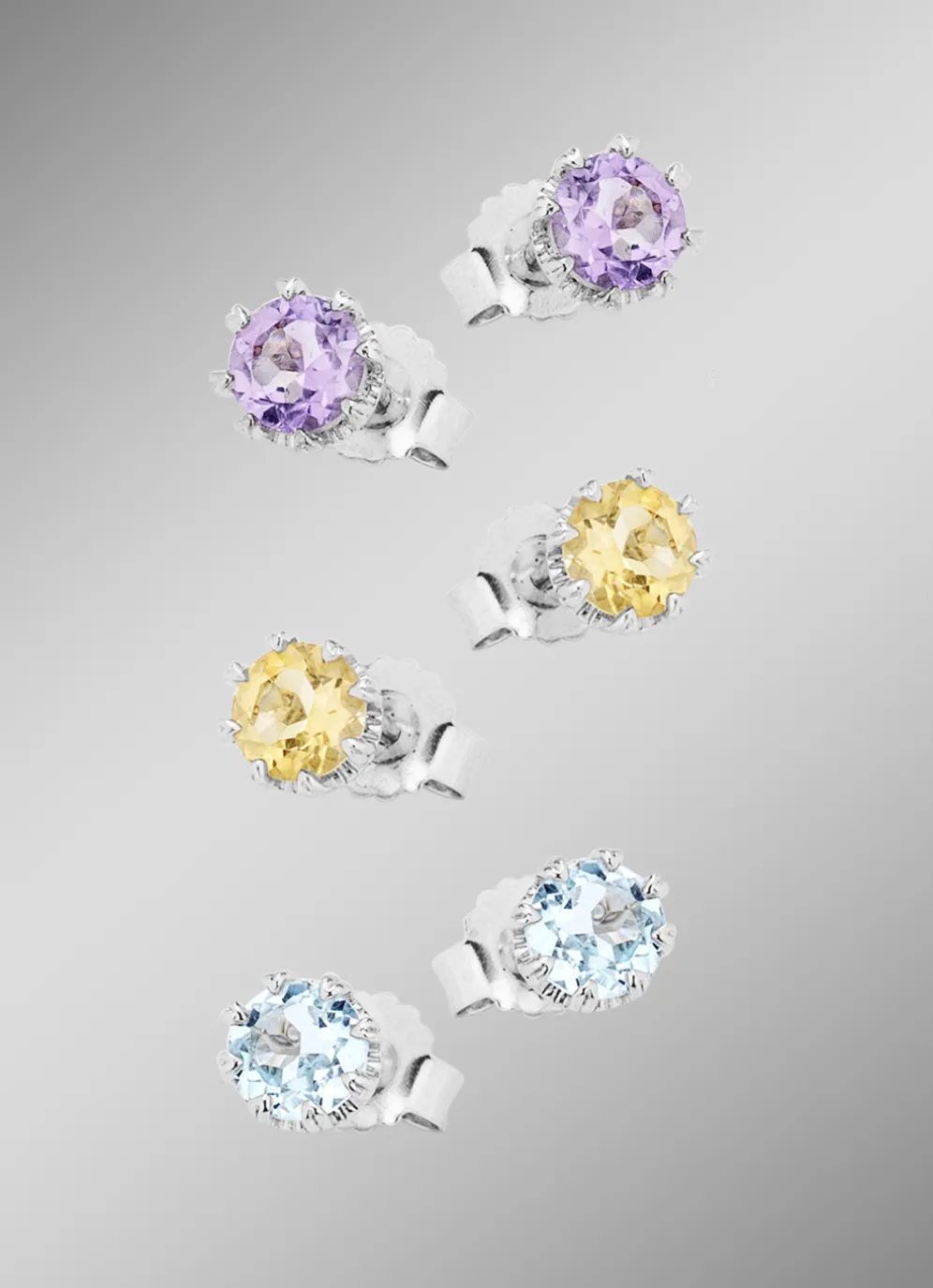 Funkelndes Ohrstecker-Set, 3 Paar aus Silber 925/- fein. Sie sind jeweils mit echt Amethyst, echt Citrin und beh. Blautopas verziert und verleihen Ihrem Outfit eine besondere und vor allem schöne Note. Der Ohrschmuck hat einen Durchmesser von 6 mm.