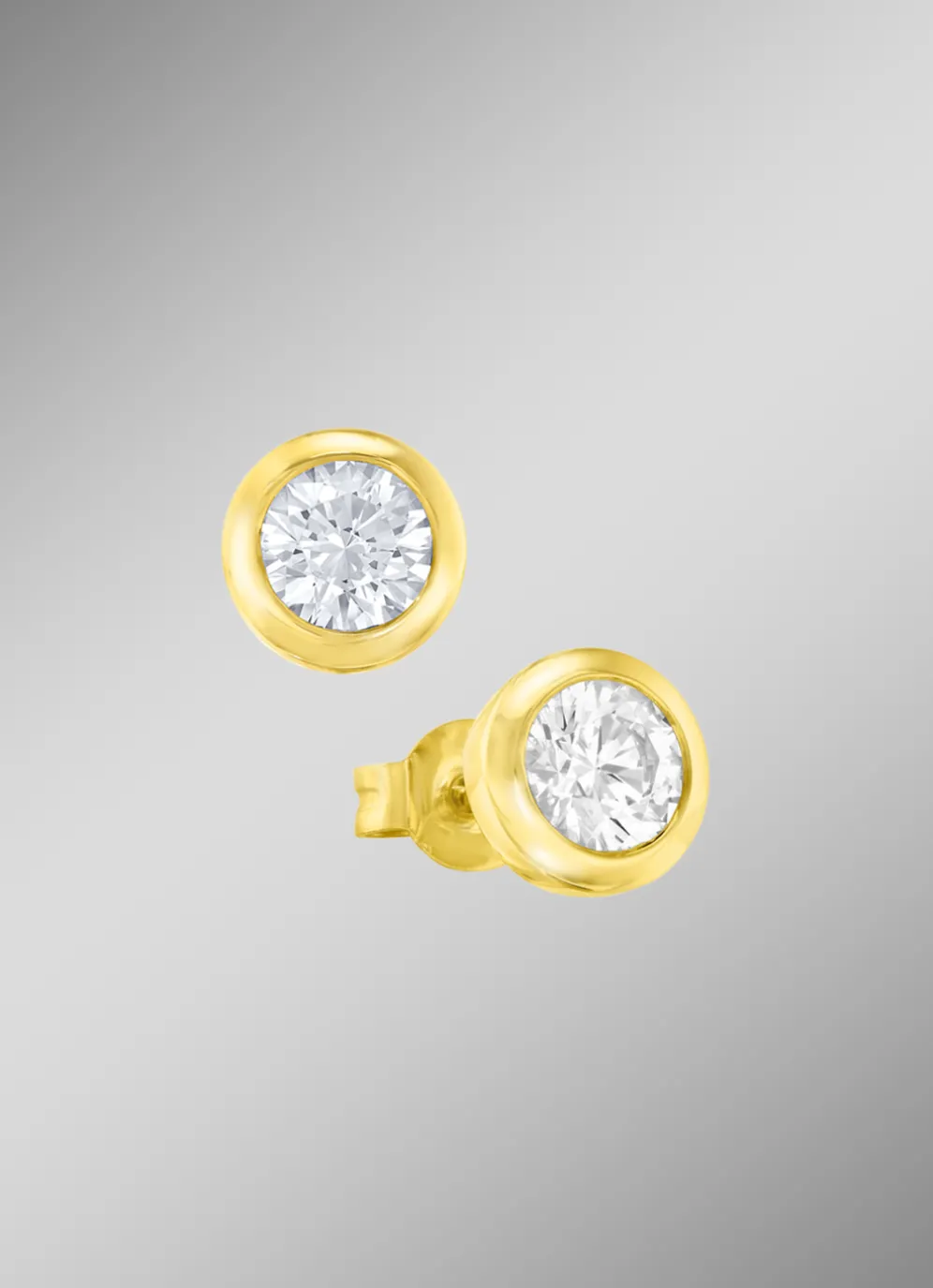 Die Ohrstecker in Gold 585/- fein, mit 2 Brillanten, Weiß, Piqué 1, in Zargenfassung schmiegen sich aufgrund ihrer weichen Form besonders harmonisch an das Ohr an und wirken so besonders elegant.