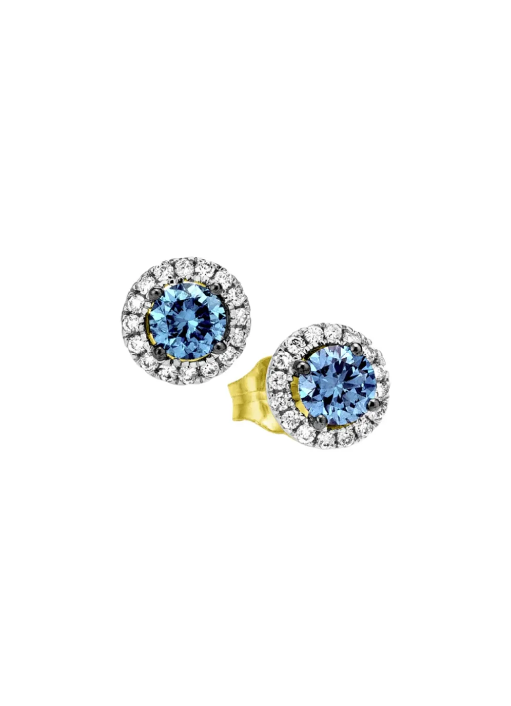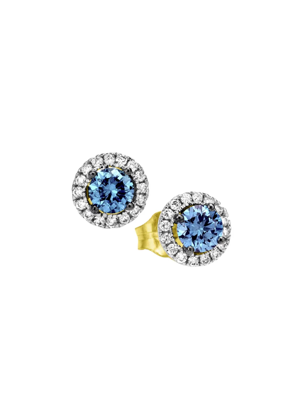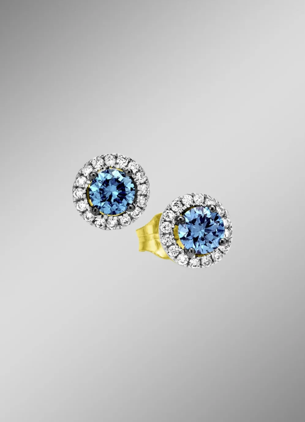 Ein strahlender Blickfang: Die Brillant-Ohrstecker veredeln jegliche Outfits mit einer Extraportion Klasse. Der ca. 6 mm große Ohrschmuck ist in Gold 585/- fein gefertigt. Im Zentrum der Ohrringe funkeln 2 blaue Brillanten in Piqué 1. Eingerahmt von 32 weißen Brillanten mit einer Caratgewicht von zusammen ca. 0,50 ct. erinnert die Komposition der Steine an die Form einer Blüte.
