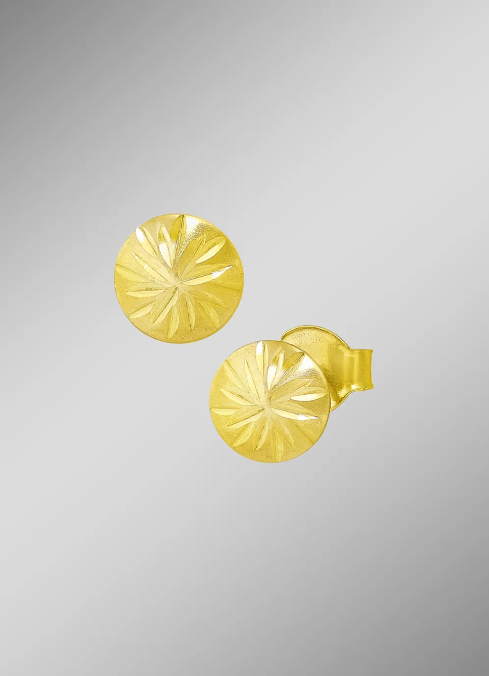 Das einem kleinen Goldbutton ähnelnde leicht gewölbte Plättchen misst ca. 6 mm im Durchmesser und besitzt einen schönen Diamantschnitt, der in seiner Anordnung einer Blüte gleicht. Sehr zart und leicht wirken die Schmuckstücke in ihrer feinen Art und fangen jeden Strahl der Sonne ein. Nutzen Sie die Gelegenheit diese Gold-Ohrstecker jeden Tag zu tragen!