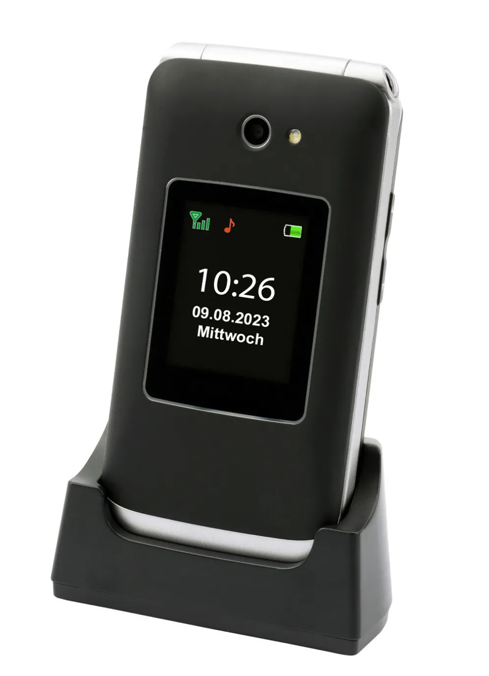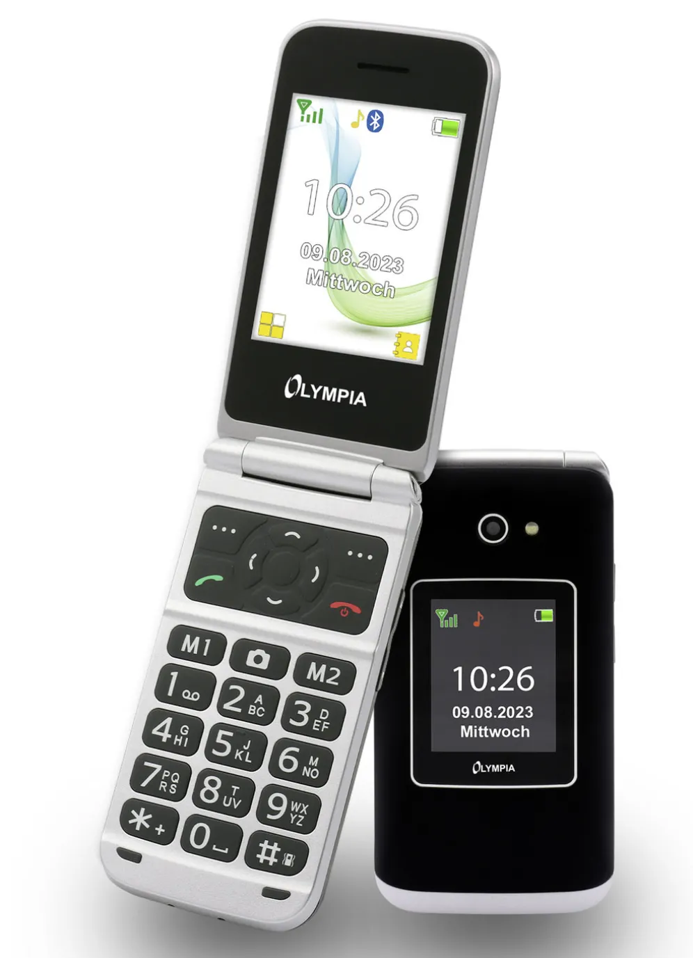 Olympia VITUS 4G. Klapphandy mit Großtaten, extragroßer Schrift und extralautem Klingelton. Es verfügt über ein 2,88″ (7,1 cm) großes, kontrastreiches LCD-Farbinnendisplay und ein 1,7″ (4,3 cm) LCD-Farbaußendisplay mit Anzeige von Datum, Uhrzeit, Nachrichten oder wer gerade anruft. Notruftaste mit SOS-Tonalarm sowie SOS-Anruf/SMS-Funktion für bis zu 5 hinterlegte Rufnummern. Hörgerätekompatibel, Kamera, Bluetooth, Freisprechfunktion, Kartenfach für Micro-SD mit bis zu 64 GB. Bildkurzwahl, 2 Direktwahltasten, Freisprechfunktion, FM Radio, Taschenlampe, Wecker. Dual-SIM-Funktion. Maße: B5,6xH10,6xT1,9 cm