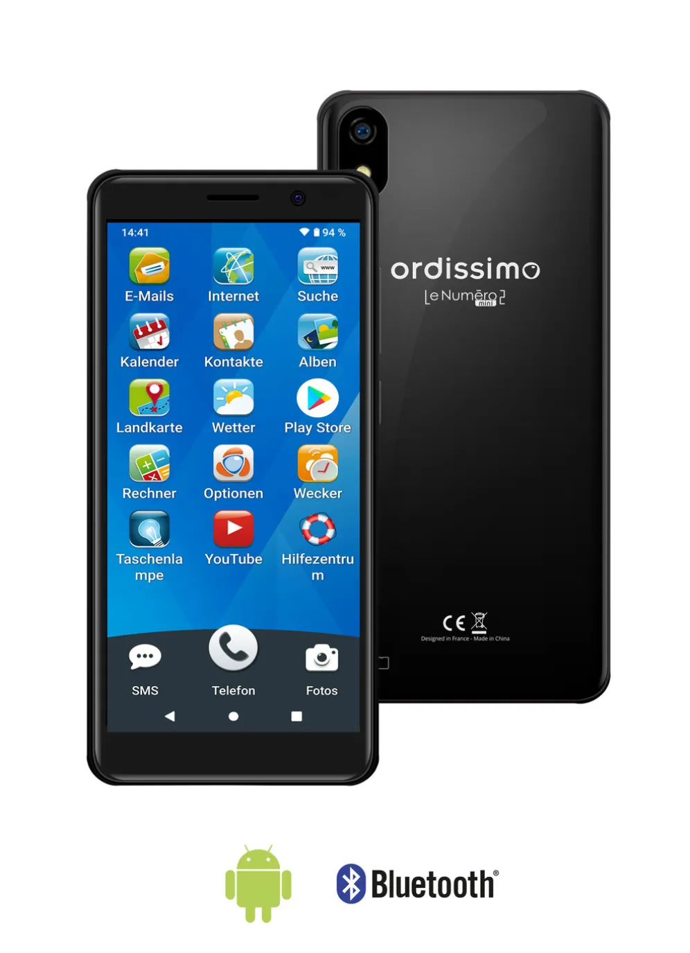 Ordissimo Smartphone LeNuméro2 mini mit 5,5’’ (13,84 cm) HD IPS Touchdisplay. Betriebssystem Android 13. Interner Speicher von 32 GB (erweiterbar mit Micro-SD-Karte auf bis zu 128 GB). Die Rückkamera verfügt über 8 Megapixel, die Frontkamera über 5 MP. Fotokontakte bei eingehenden Anrufen, Telefonbuch für bis zu 25000 Einträge, FM Radio, Bluetooth, Wlan. Mit Dual-Sim Funktion. Maße: ca. B7,2xH15xT1,1 cm