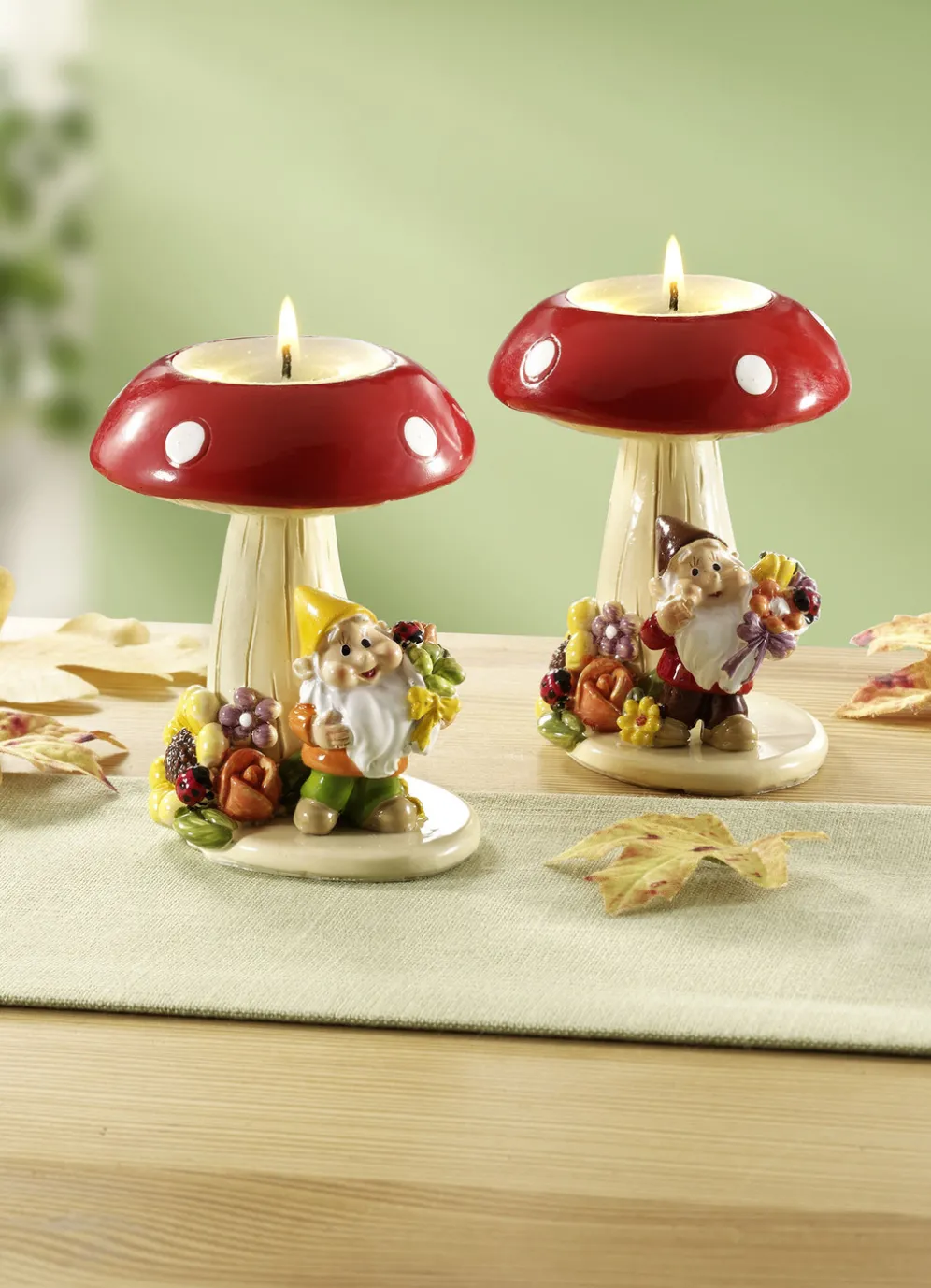 Dieses originell gestaltete 2er-Set Teelichthalter wird Sie begeistern. Zwei Zwerge stehen unter Pilzen und genießen die Herbstsonne. Liebevoll aus Polyresin gefertigt und bemalt. Die Lieferung erfolgt ohne Teelichter.