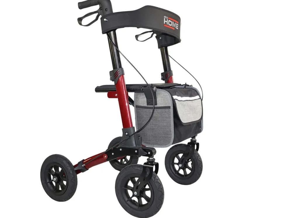 sind Sie draußen sicher unterwegs. Denn der Rollator ist für die Nutzung auf unebenem Untergrund konzipiert und daher auch für Kopfsteinpflaster, Kies-, Wald- und Feldwege ideal geeignet. Hervorragende Dämpfungseigenschaft dank Luftbereifung (Ø 24 cm) mit Autoventil. Die Stufen- / Ankipphilfe beidseitig, hilft beim Überwinden von Hindernissen. Griffe sind leichtgängig 7-fach höhenverstellbar von 81,5-96 cm. Auf dem wasserabweisenden, gepolsterten Sitzkissen (T25xB45,5cm) mit einer Dicke von 1-1,5 cm und der mit Schaumstoff aufgepolsterten Rückenlehne können Sie es sich bei einer Sitzhöhe von ca. 58 cm bequem machen. Hilfreich für unterwegs ist der abnehmbare Gehstockhalter und die mit einem längenverstellbaren Schulterriemen mit Reflektorstreifen vorne versehene Tasche mit 18,5 Liter Volumen (H28xB35,5xT19cm), in der sich einige Einkäufe (bis 5 kg) verstauen lassen. Die Funktionselemente wie die Höhenverstellung der ergonomischen Griffe und Klappmechanismus sind farblich hervorgehoben. Bei Nichtgebrauch einfach den Rollator über eine Zugschleife an der Sitzfläche hochziehen, zusammenklappen und platzsparend (H28xB58xT40cm) im Zimmer, Schrank oder Auto verstauen. Mit Aufbauanleitung.