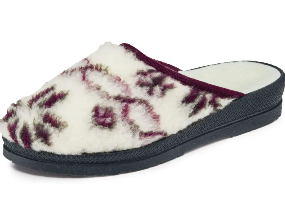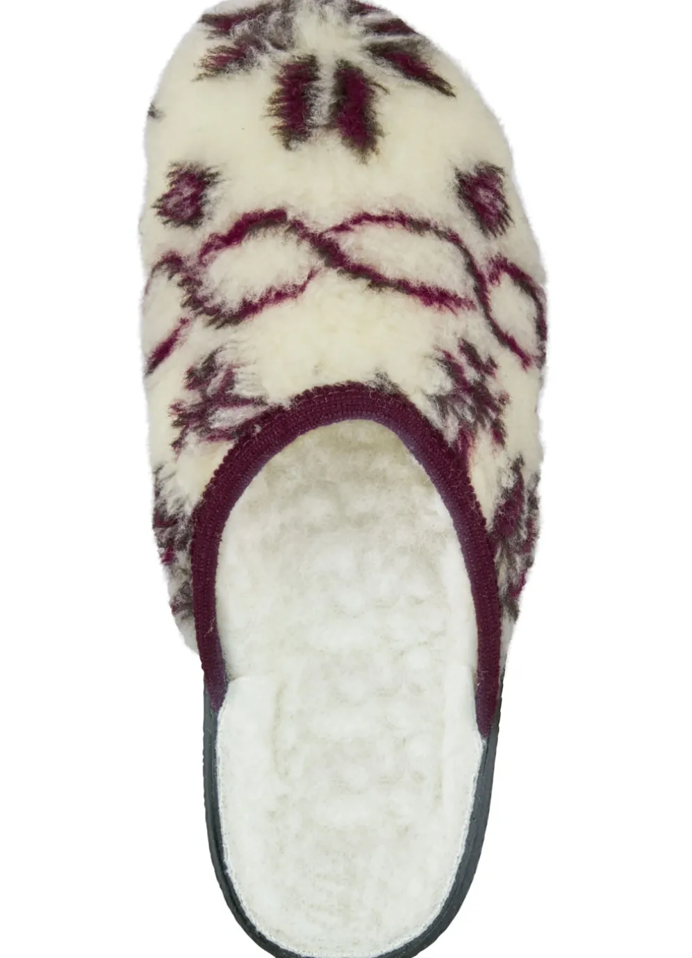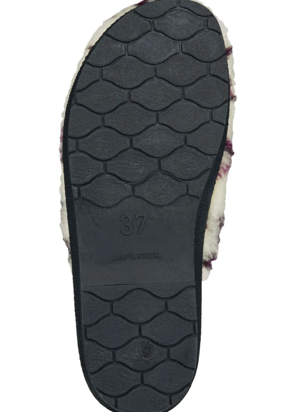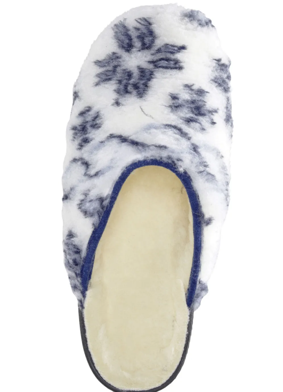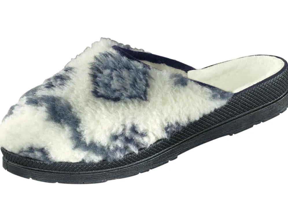 Pantoffel aus bedrucktem Plüschmaterial: Warmfutter und Fußbettbezug aus 100% Schurwolle, PVC-Laufsohle sowie 20 mm Keilabsatz
