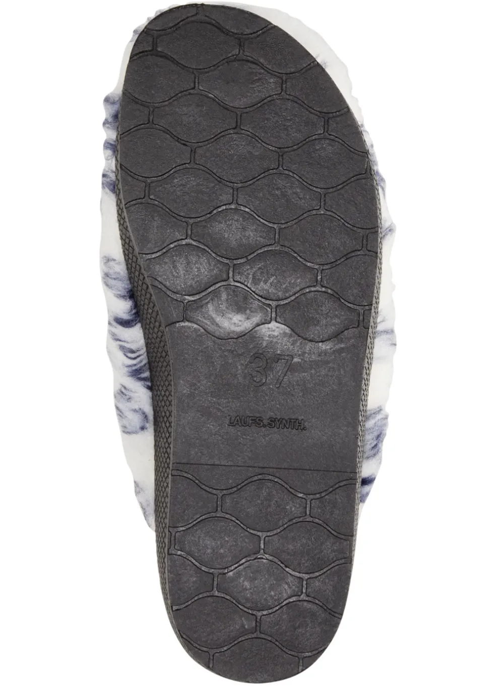 Pantoffel aus bedrucktem Plüschmaterial in Ecru-Blau und in Größe 38.